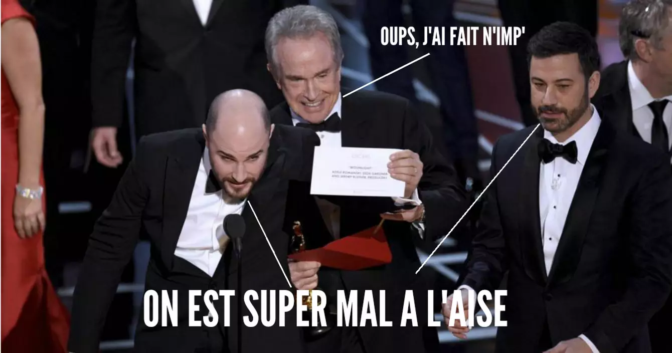 Merci les Oscars, Warren Beatty et Faye Dunaway pour cet intense moment malaise au moment de la remise de l'Oscar du meilleur film. Mais le producteur de La La Land, Jordan Horowitz, est quand même assez classe quand il se rend compte de ce qu'il se passe.