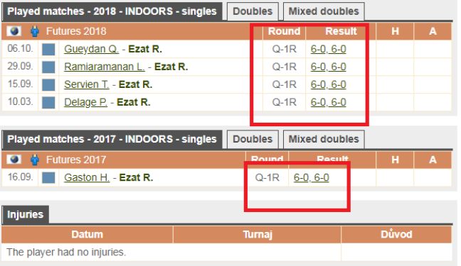 Article mythique. Ils sont un certain nombre d'amateurs fortunés (classés 30/4 ou 30/5, c'est-à-dire à peu près le niveau que tu as après 6 mois de tennis) à courir les tournois professionnels de catégorie inférieure partout dans le monde. Ils s'inscrivent sur liste d'attente et parfois entrent dans le tableau. Et là, c'est la branlée : ils ne marquent jamais un jeu. Parfois ils ne marquent pas un point. C'est le cas de Ramy Ezat, dont le tableau de statistiques est exceptionnellement triste.