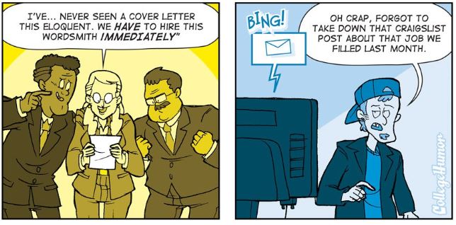 Réalité : « Nous sommes au regret de vous apprendre que l'emploi pour lequel vous avez postulé a déjà été recruté ».