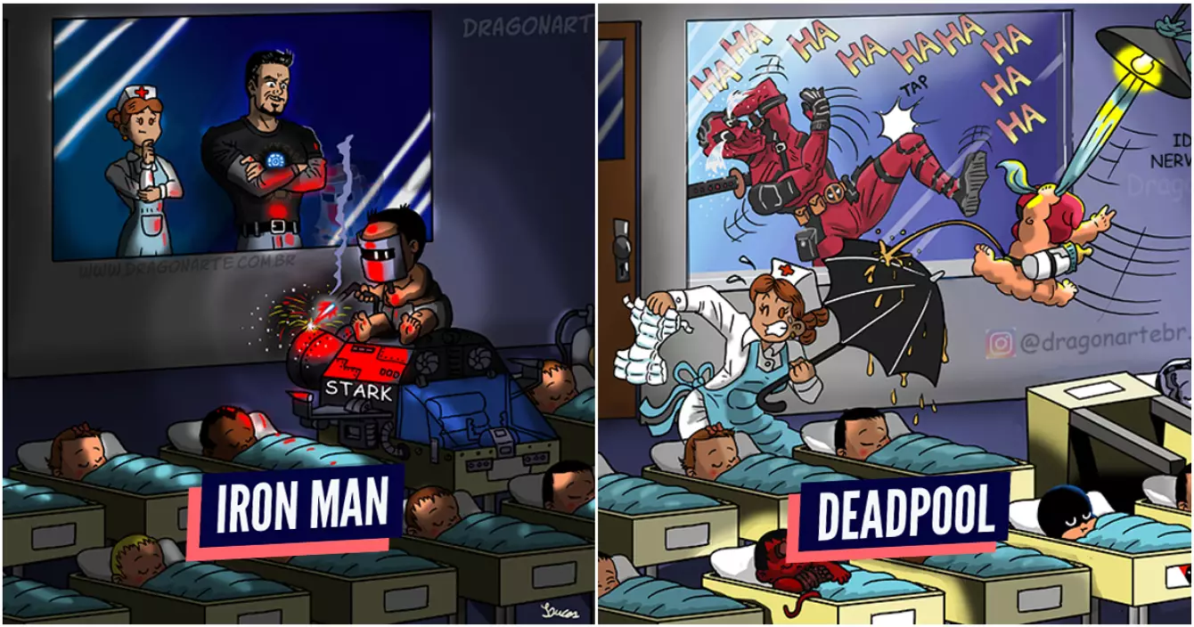 Les super héros ont beau être super, ils ont peut être aussi envie d'avoir des enfants et de se lever à 3h du matin pour s'occuper de bébé au lieu d'aller sauver Martine qui est coincée dans un arbre. L'artiste se nomme Dragonarte, et il a imaginé les bébés des super héros.