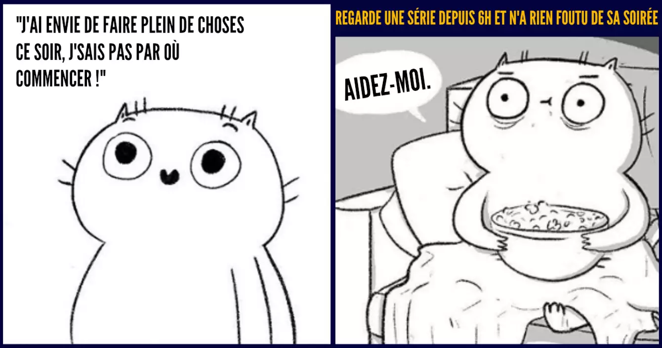 Deux illustratrices se cachent derrière ce compte Instagram qui fait vivre avec beaucoup d'humour, ce chat plutôt flemmard et adepte de la procrastination. Et si toi aussi tu es une grosse larve capable de passer moult heures devant des séries Netflix, ces illustrations devraient te plaire…