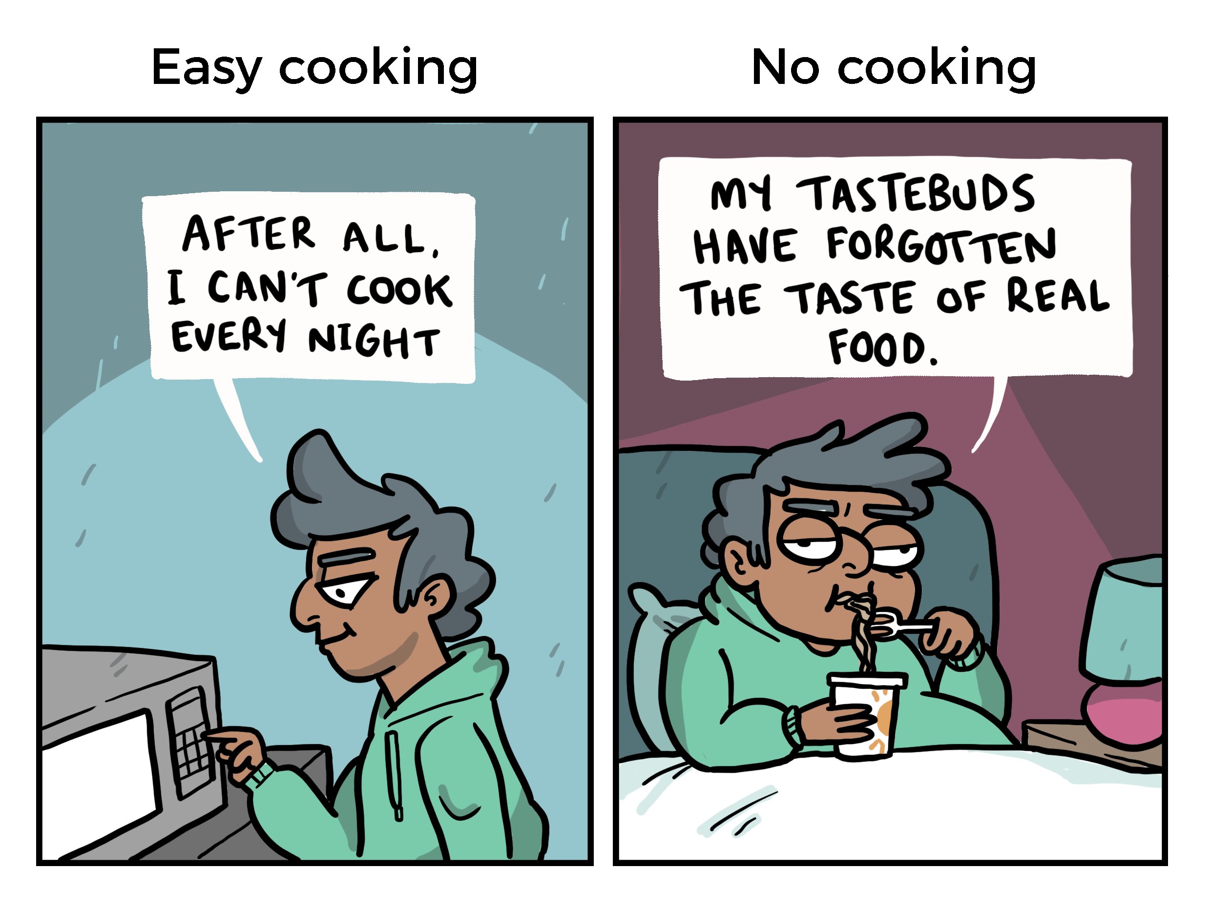 « Après tout, j'peux pas faire à manger tous les soirs. »