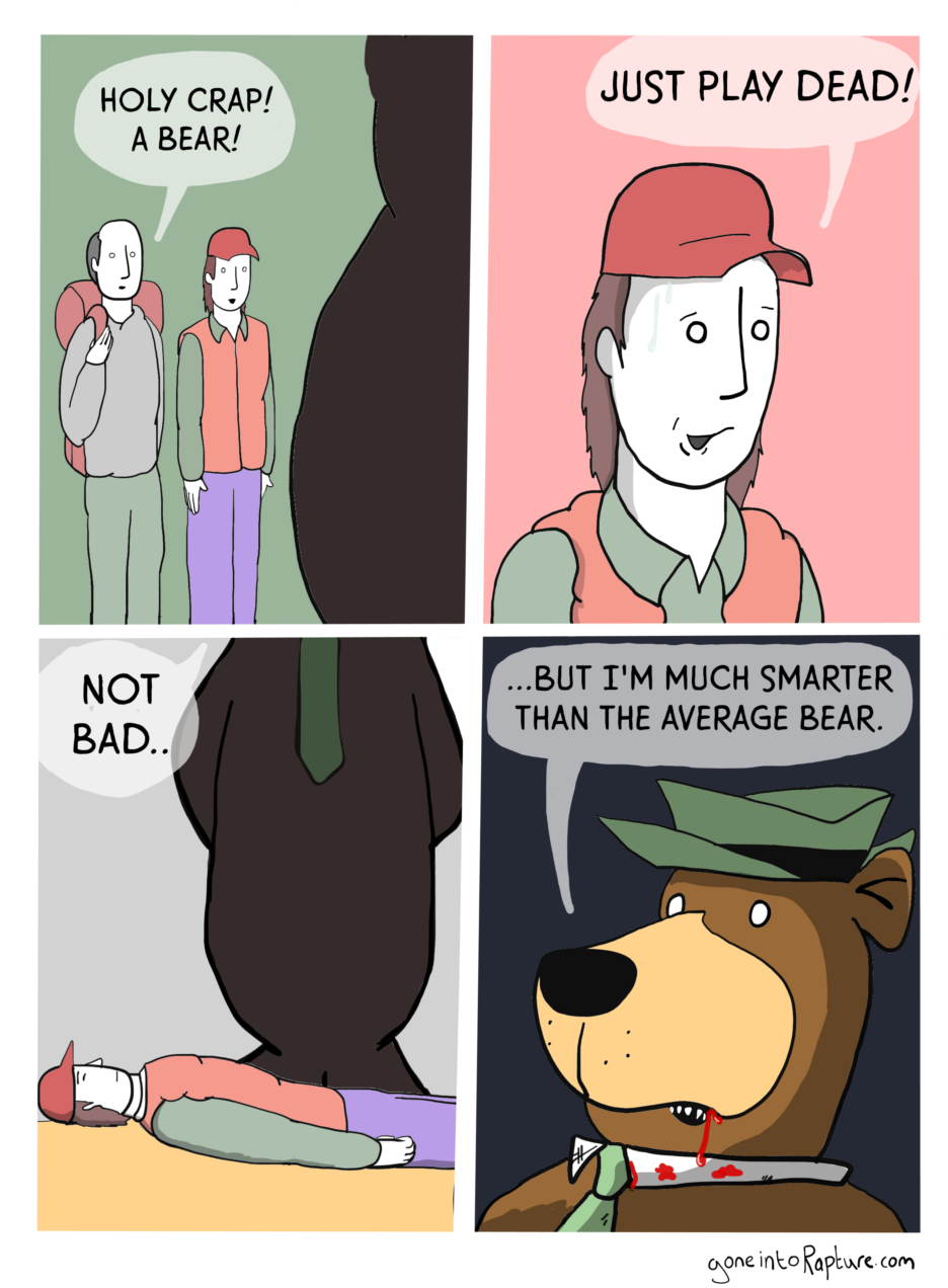 "Mon dieu un ours"/"Fais le mort !"/"Pas mal...Mais je suis plus intelligent qu'un ours lambda."
