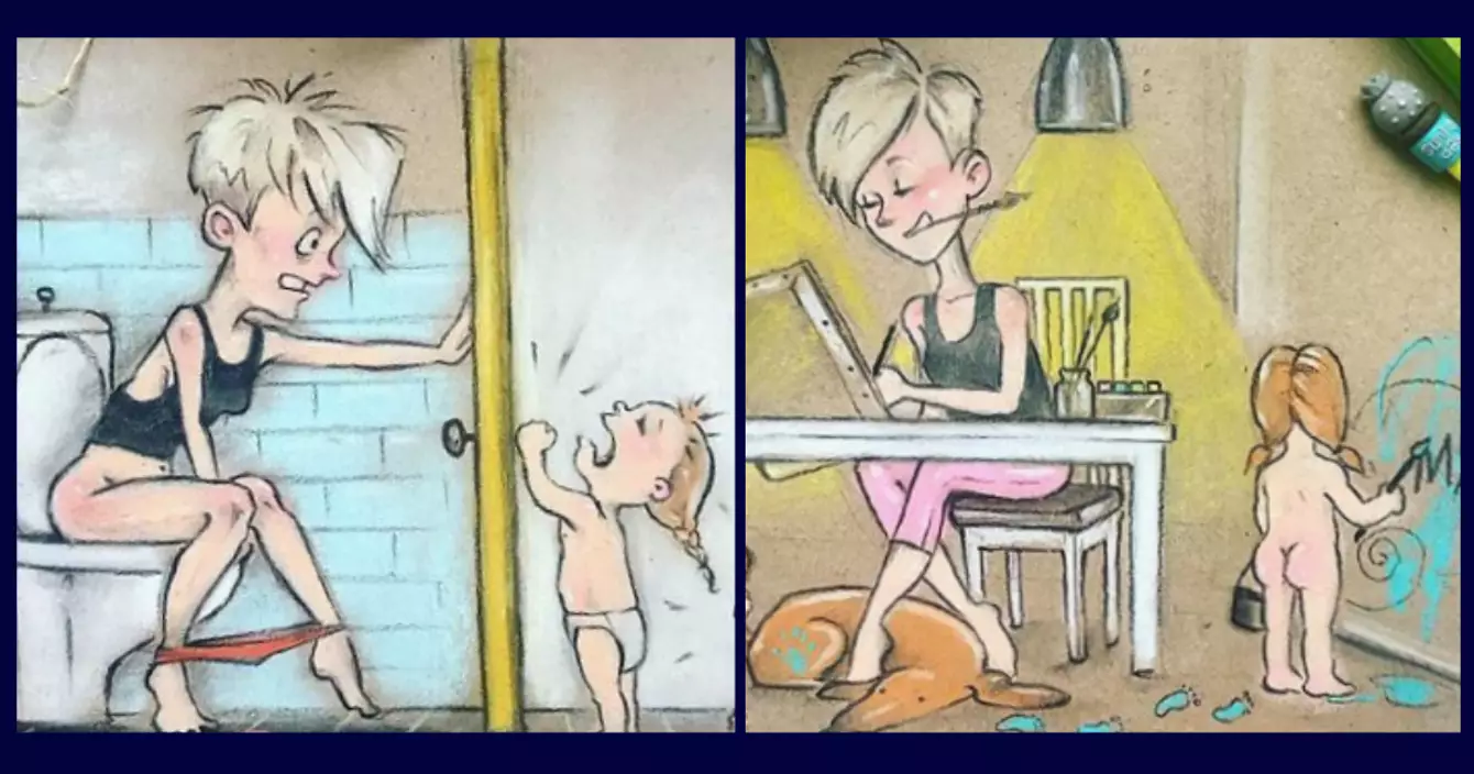 Maria Gorbunova, artiste russe plutôt talentueuse nous raconte son quotidien de jeune maman par le biais de superbes illustrations (sur papier, ce qui est plutôt rare de nos jours) (tout le monde ne sait pas utiliser une tablette graphique, flûte). Et le moins que l'on puisse dire, c'est que le talent est présent.