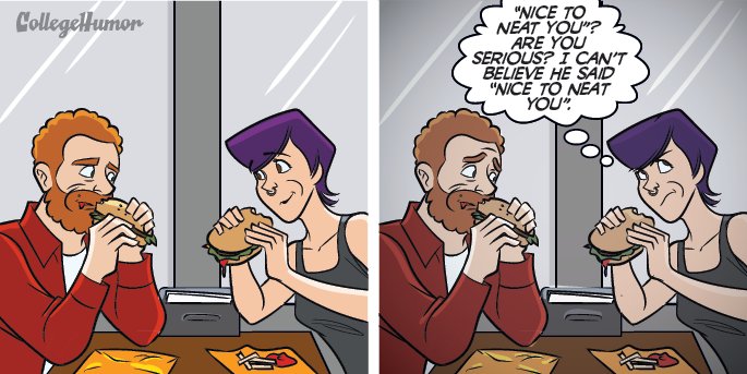 Dans la tête d'un(e) timide : « Enchanté de te pénétrer » ? T'es sérieux ? Je n'arrive pas à croire qu'il ait dit « Enchanté de te pénétrer ». (Vous voyez, c'est quand même vachement mieux comme ça)