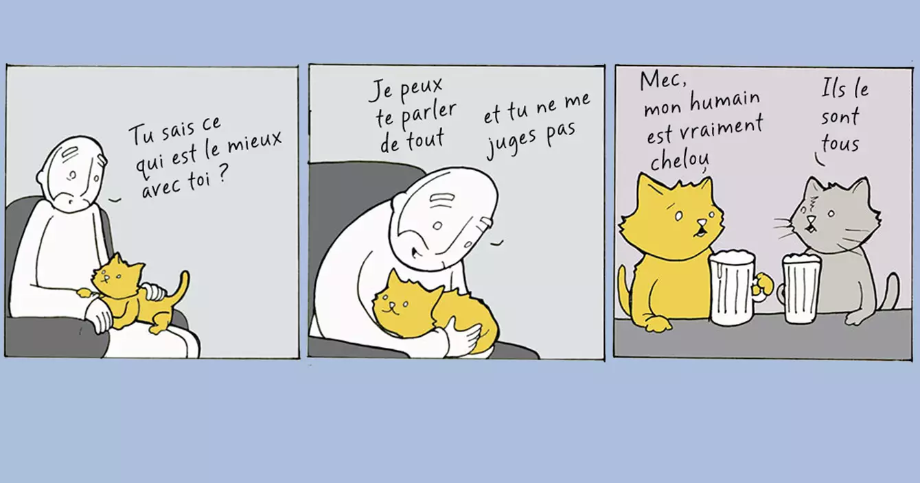 - Hey le chat, tu sais ce qu'il y a de mieux chez toi ? Je peux te parler de tout, et je sais que tu ne me jugeras pas, merci.
