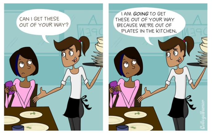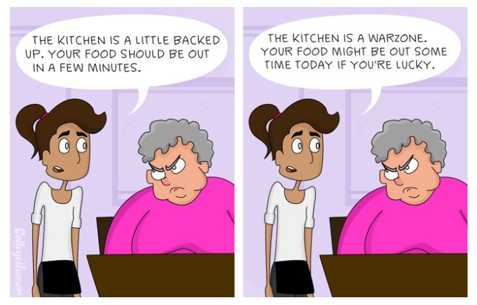 La cuisine est un peu surchargée, votre plat devrait arriver dans quelques minutes. / La cuisine est une zone de guerre, votre plat devrait arriver aujourd'hui si vous avez de la chance.
