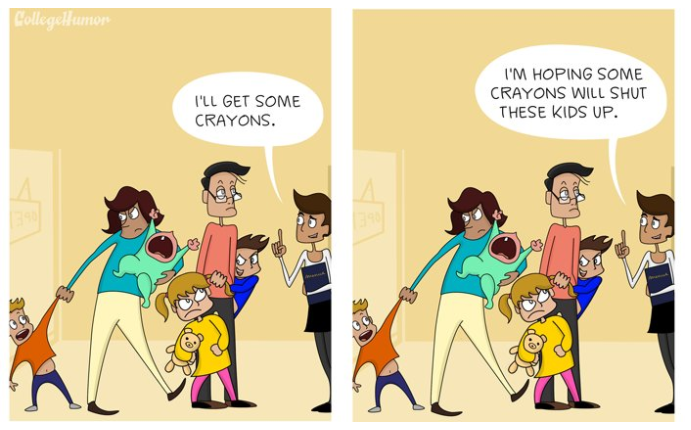 Je vais chercher des crayons pour les enfants. / J'espère que les crayons arriveront à calmer vos sales gosses.