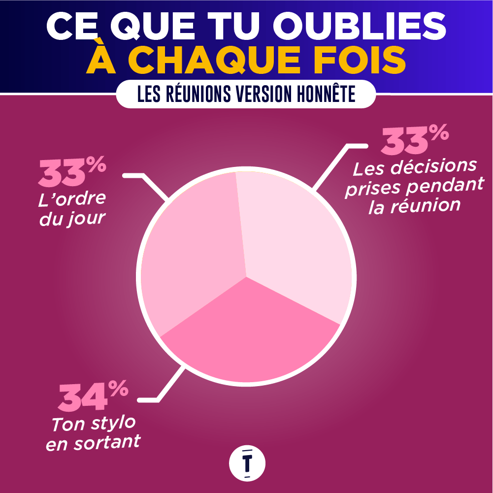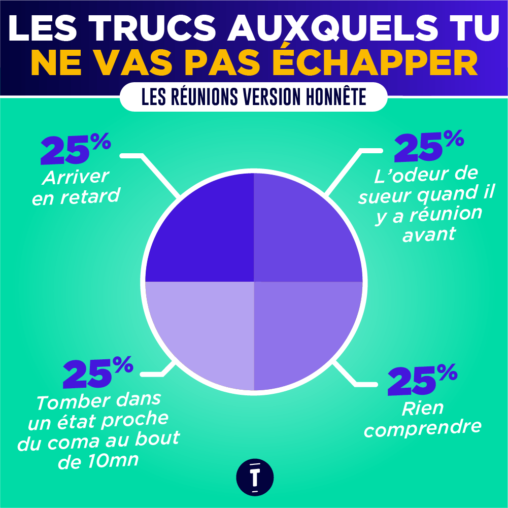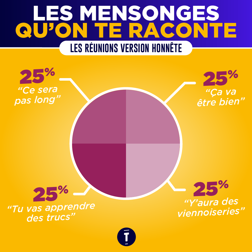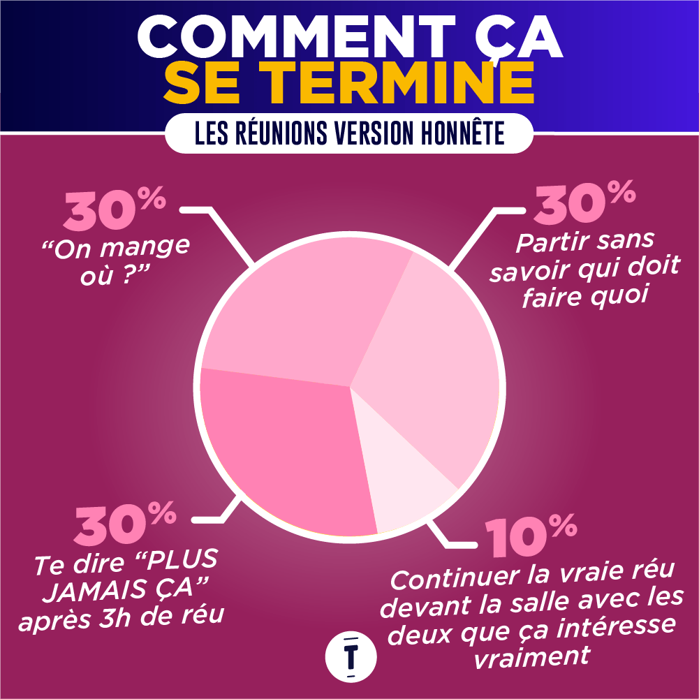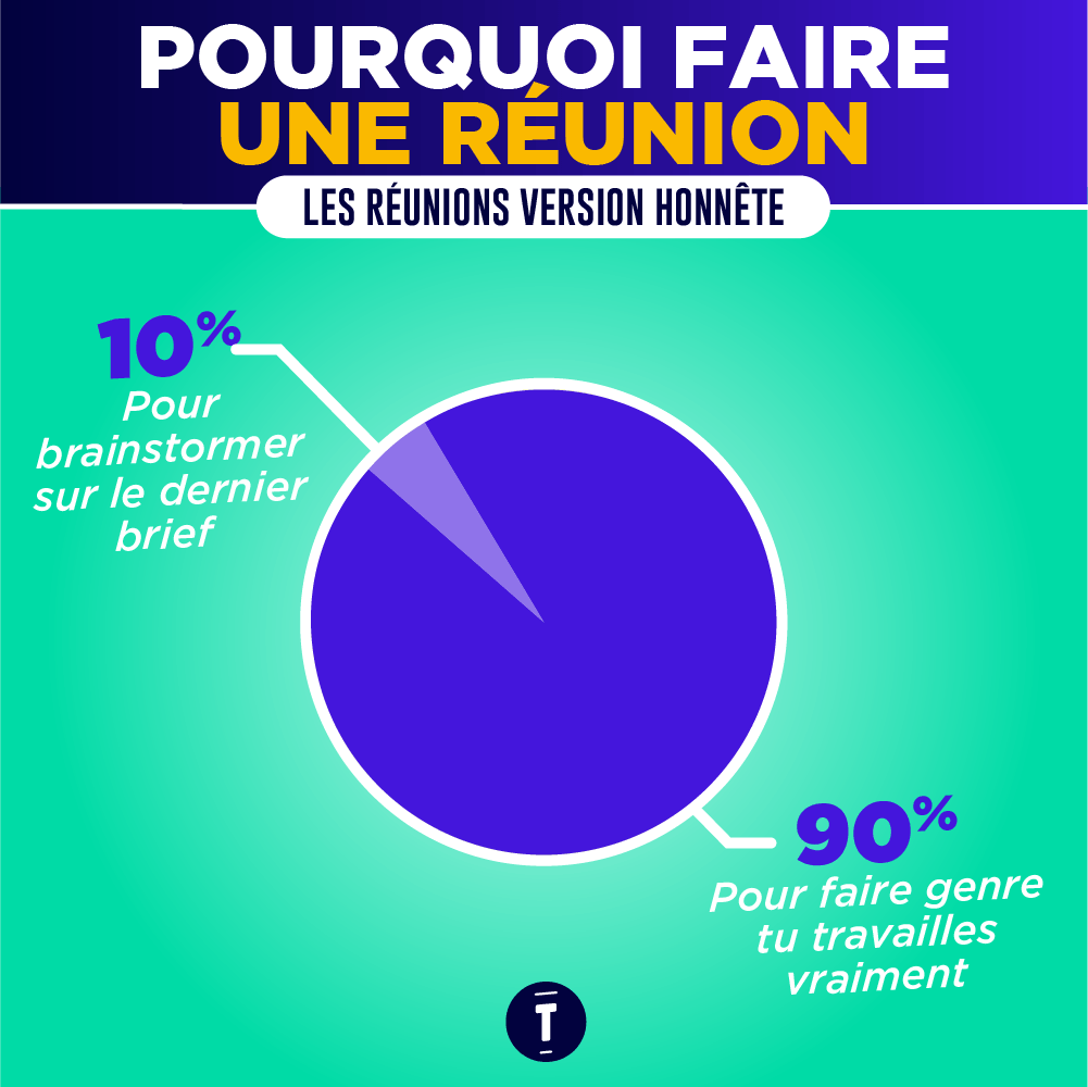 Soyons honnêtes : la plupart du temps on y va, mais surtout parce qu'on est obligé et on s'y emmerde un peu, même si on essaie de montrer le contraire en rigolant trop fort à des blagues pas drôles. Et si vous n'en n'avez pas conscience, c'est peut-être que vous souffrez de réunionite aigüe. Les réunions au boulot si on se disait la vérité, ça serait plutôt ça…