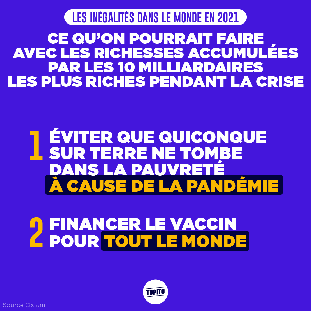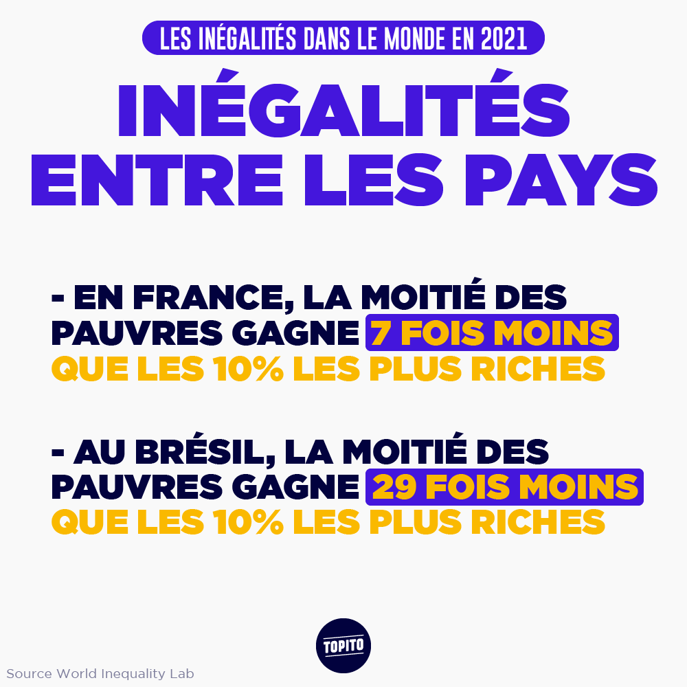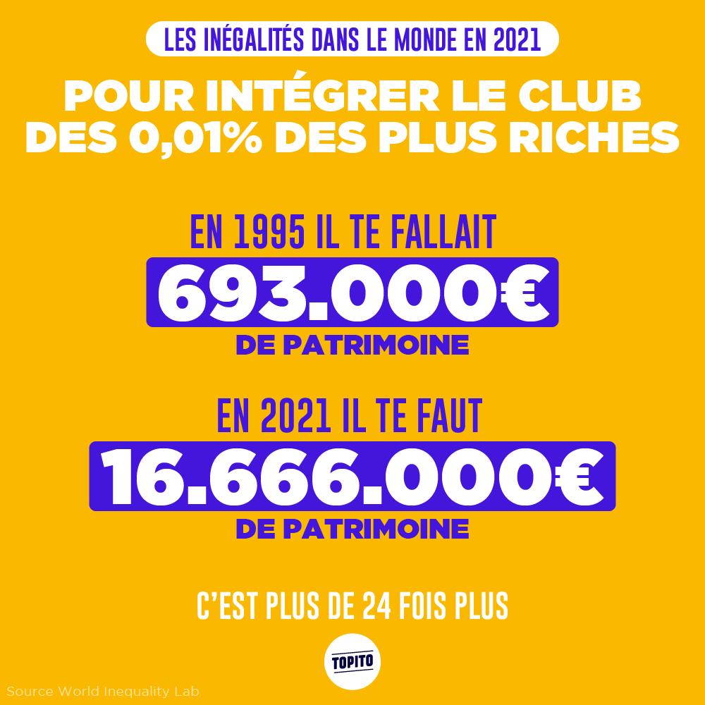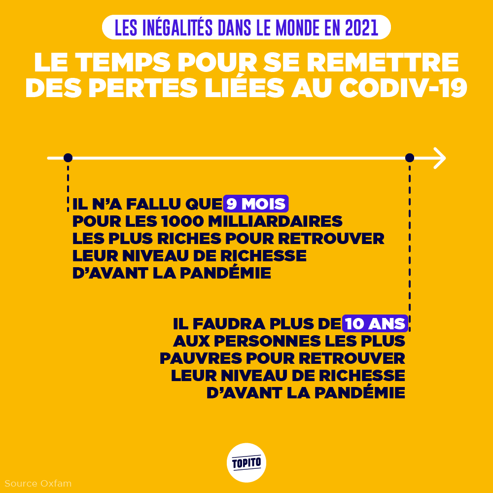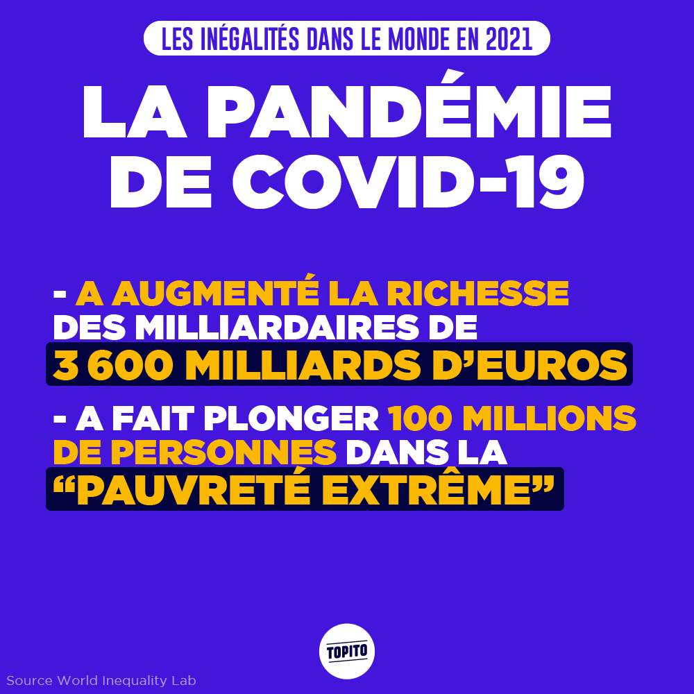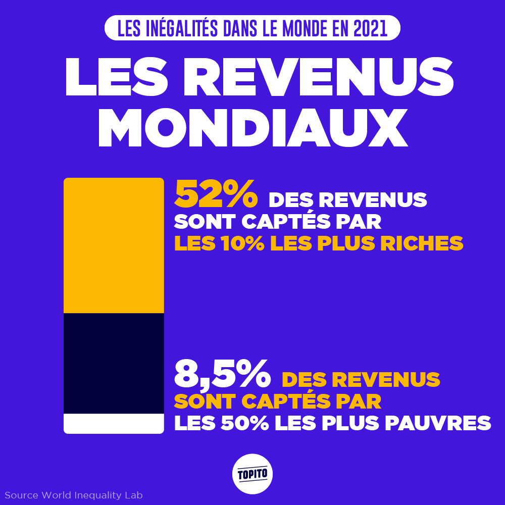 Si vous croyez encore en la Déclaration des Droits de l'Homme et son « Tous les hommes naissent libres et égaux en droits », préparez-vous à sérieusement en douter. Car oui, en cette fin d'année, Oxfam et le World Inequality Lab ont chacun sorti leur rapport sur les inégalités dans le monde, et le constat est tout sauf réjouissant. En gros, ces dernières années, les riches ont continué à s'enrichir, les pauvres à s'appauvrir, et le Covid n'a pas du tout arrangé les choses. Entre les hommes et les femmes, contrairement à ce qu'on pourrait penser, les inégalités sont quasi toujours aussi fortes qu'il y a 20 ans, et tout met trop de temps à bouger. Mais comme c'est toujours plus compréhensible avec des images, on vous présente quelques points de ces rapports en infographies. Préparez-vous parce que ça fout le cafard.