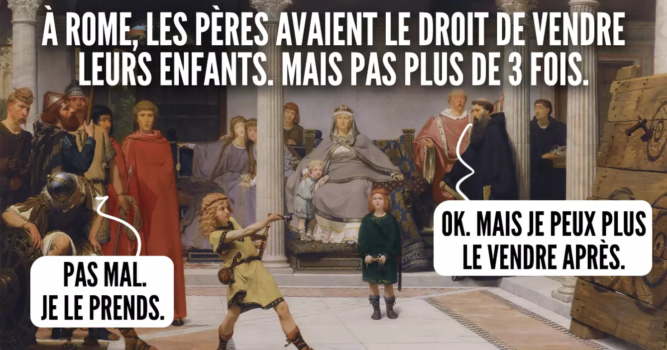 Les pères, à Rome, avaient le droit de vendre leurs enfants comme esclaves pour une durée limitée. Ensuite, le gosse revenait à la maison comme si de rien n'était. Par contre, il était interdit de faire ce truc plus de trois fois par enfant, sans quoi le gosse était émancipé d'office. En même temps c'est pratique quand on ne sait pas quoi faire de ses gosses pendant les vacances d'été et qu'en plus on est un peu juste niveau thunes.