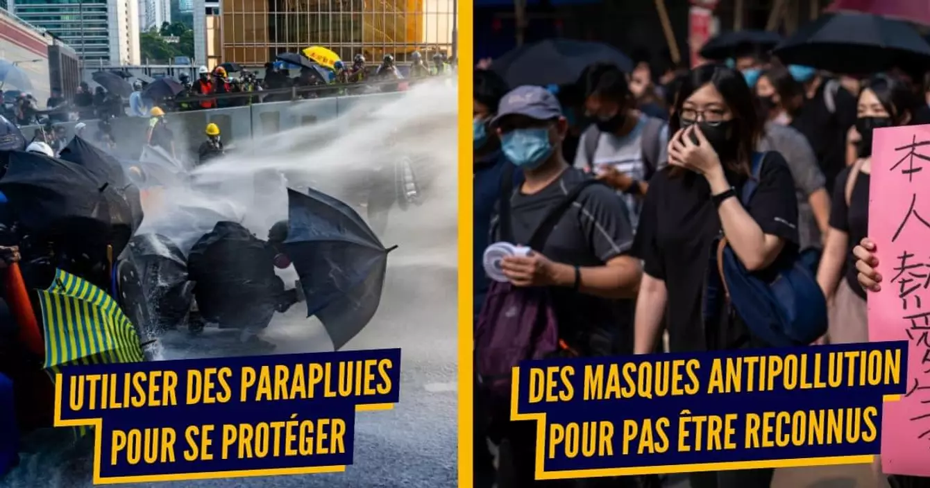 Comme vous l'aurez compris, les manifestants sont bien harnachés : parapluie, casque, masque à gaz, masque médicaux etc. Quand ils leur manque un de ces outils, ils mettent en place une gestuelle reconnaissable pour tout le monde afin de leur faire parvenir le matos avec des chaînes humaines savamment organisées.