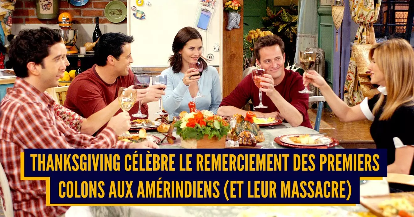 Ce jour de fête célébré aux Etats-Unis le 4ème jeudi du mois de novembre et le 2ème lundi d'octobre au Canada, durant lequel on se gave de dinde jusqu'à ce qu'indigestion s'ensuive, a des origines plutôt effrayantes… Pour cela il faut remonter au XVIIème quand les pères fondateurs ont découvert le Nouveau-Monde. Accueillis à bras ouverts par les amérindiens, les premiers pèlerins ont fait une fête de remerciement en leur honneur. Sauf qu'après ils les ont colonisé et massacré. Le truc marrant c'est que Thanksgiving célèbre le partage de la nourriture entre Amérindiens et premiers colons du Massachusetts, mais c'est aujourd'hui pris en dérision parce que les Amérindiens galèrent un max. Thanksgiving est en fait la consécration du génocide le plus long de l'histoire puisqu'il s'étend maintenant sur plus de 450 ans. Happy Birthday.