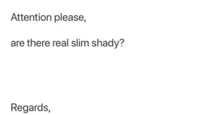 « Votre attention s'il vous plaît, y a t-il des vrais slim shady ? Cordialement. »