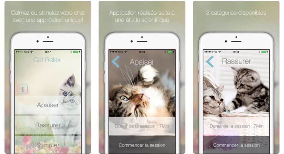 Cat Relax propose des ambiances sonores pour apaiser, relaxer ou stimuler votre chat. Il suffit de diffuser ces sons composés exprès pour les félins dans la pièce où ils se trouvent. L'appli est payante mais à un prix raisonnable et offre beaucoup de contenus. De toute façon on sait que rien n'est jamais trop cher pour vous quand il s'agit de gâter votre chat.
