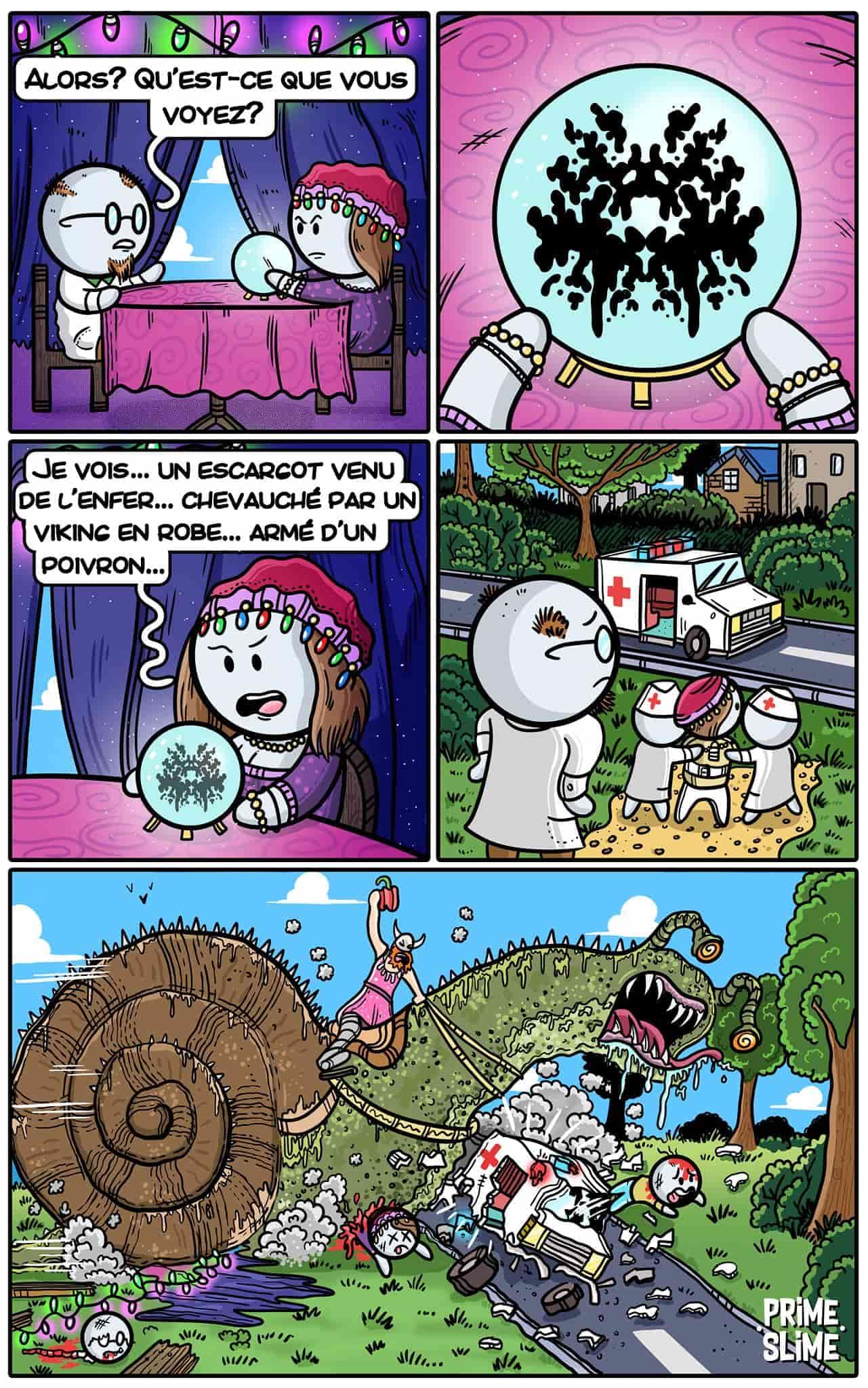 Est-ce que vous connaissez Prime Slime ? C'est tout simplement le créateur de Comics le plus drôle qu'on peut retrouver sur Instagram ou Facebook. Ses BD allient beaucoup d'absurde, un peu de gore, un peu de fantastique et encore beaucoup d'absurde. Un cocktail qui nous envoie directement dans le monde du rire et ses crampes abdominales. Matez-ça et vous verrez.