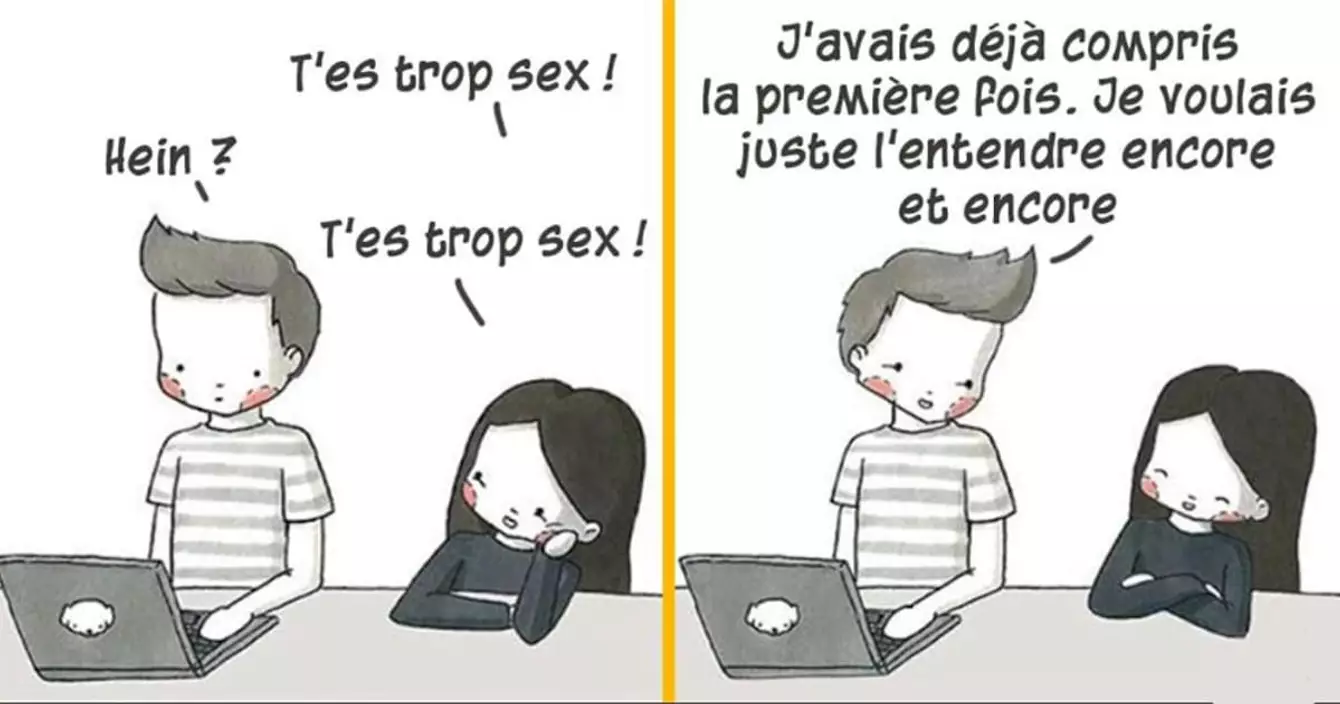 « T'es trop sex. » « Quoi ? » « T'es trop sex. » « Quoi ? » « J'ai dit que t'étais trop sex. » « J'avais entendu la première fois, je voulais juste t'entendre encore et encore le redire. »