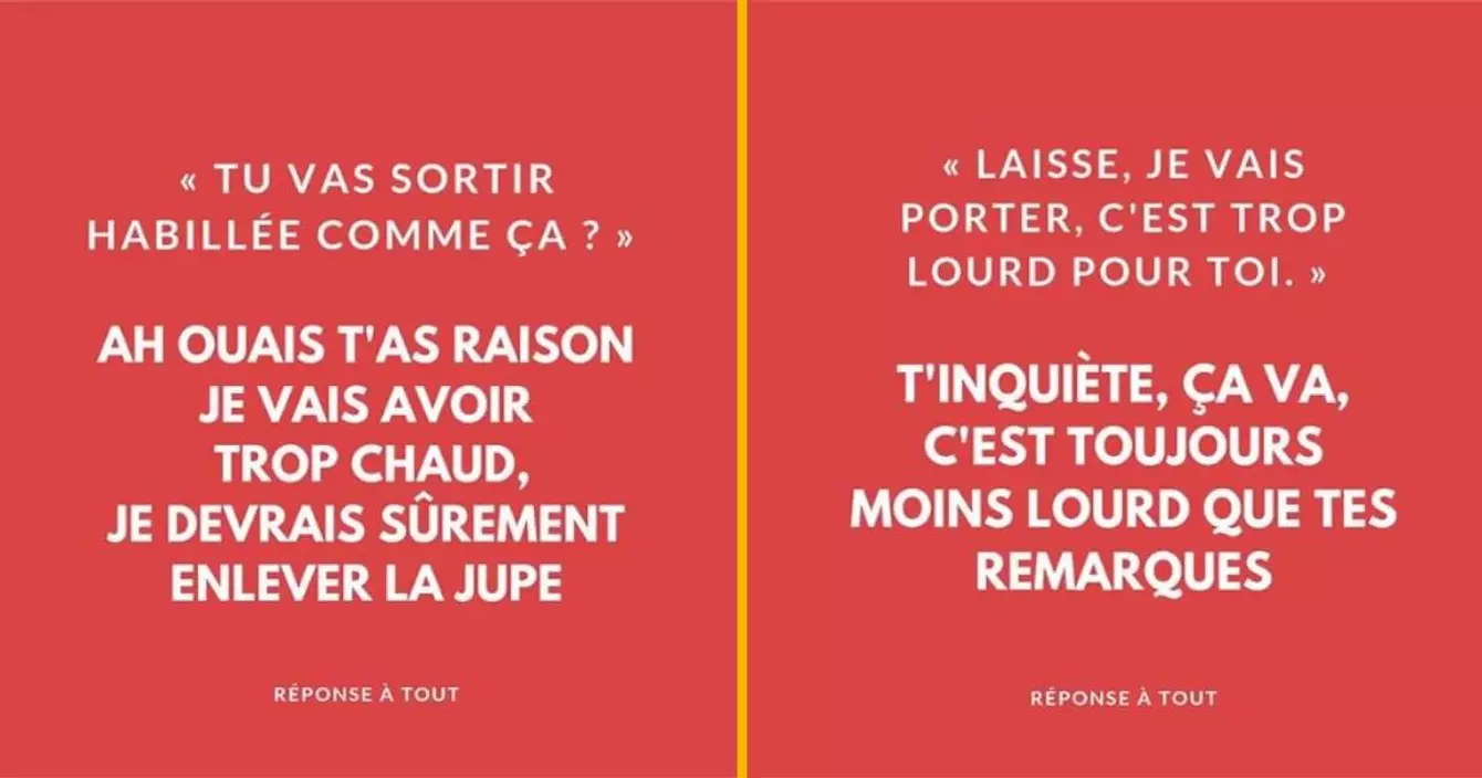 Salut tout le monde, je reviens de vacances et j'ai un bronzage en forme de t-shirt et je vais vous parler de quelque chose qui n'a aucun rapport avec ça. Le compte Instagram @Réponse.a.tout a trouvé sa voie : donner de bonnes réponses pour contrer des commentaires sexistes (mais aussi racistes). Si vous ne savez pas quoi répondre quand on vous importune dans la rue, lors d'un dîner de famille ou en cours, maintenant vous aurez les bonnes réparties à ressortir. Bien à vous.