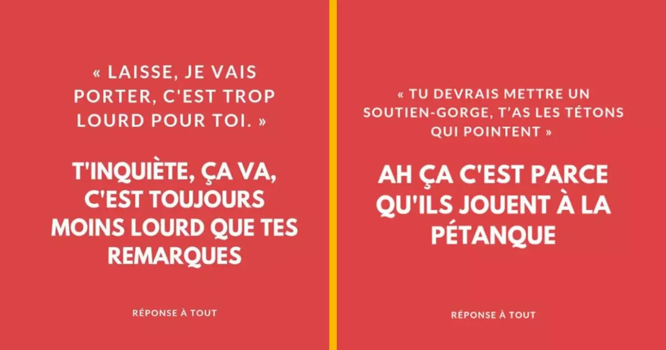 Été ou hiver, matin ou soir, en tongs ou en chaussettes, y a des choses qui bougent pas. Genre les remarques sexistes quotidiennes par ta mif, tes potes ou de sombres inconnus. Parce que ça serait trop facile de tous se traiter avec égalité, bienveillance, respect, tout ça, tout ça. Y en a qui aiment écraser les autres comme un bout de pizza sous une chaussure, que voulez-vous. Et pour ne plus se laisser faire, parce qu'au bout d'un moment ça suffit en fait, on peut compter sur des comptes Insta extraordinaires comme @reponse.a.tout qui nous donne des idées de punchlines pour répondre à ces remarques discriminatoires.