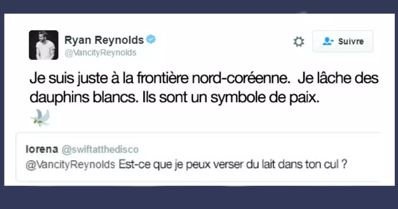 Comme James Blunt, Ryan Reynolds est à hurler de rire sur Twitter. Il s'est spécialisé dans la réponse aux propositions sexuelles. Manque de pot, chaque fois que quelqu'un lui propose du sexe, il est occupé à défendre une cause humanitaire. Florilège :