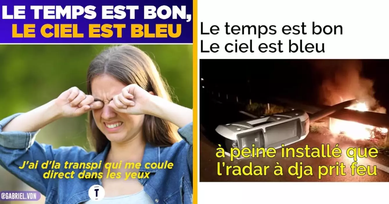 Allez, trois, quatre : le temps est boooon, le ciel est bleuuuuu. Si vous voulez plus de trucs rigolos sur l'été, on a aussi les meilleurs memes sur les moustiques, les tweets les plus drôles sur l'été, les tweets les plus drôles sur le bronzage et les tweets les plus drôles sur le barbecue. Allez, bonnes vacances hein et hydratez-vous, c'est important.