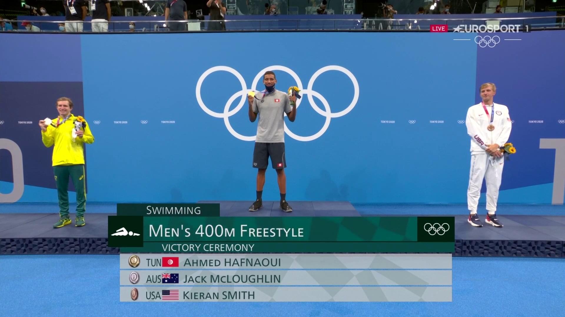 Ahmed Hafnaoui bat les australiens et américains sur 400M nage libre et crée l'exploit. Une médaille d'or à 18 ans et un sourire dont on se souviendra longtemps.