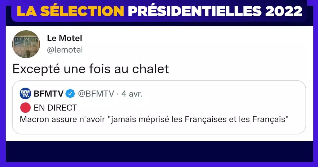Salut les petits électos ! J'espère que vous allez bien à J-3 de la plus grande élection présidentielle de l'histoire (c'est faux, même la liste des ingrédients de mon liquide vaisselle m'intéresse plus que la campagne électorale 2022, mais néanmoins voter c'est IMPORTANT). Pour vous dérider en attendant ce moment fatidique, voilà une salve de tweets toute chaude sur ces élections. A voté !