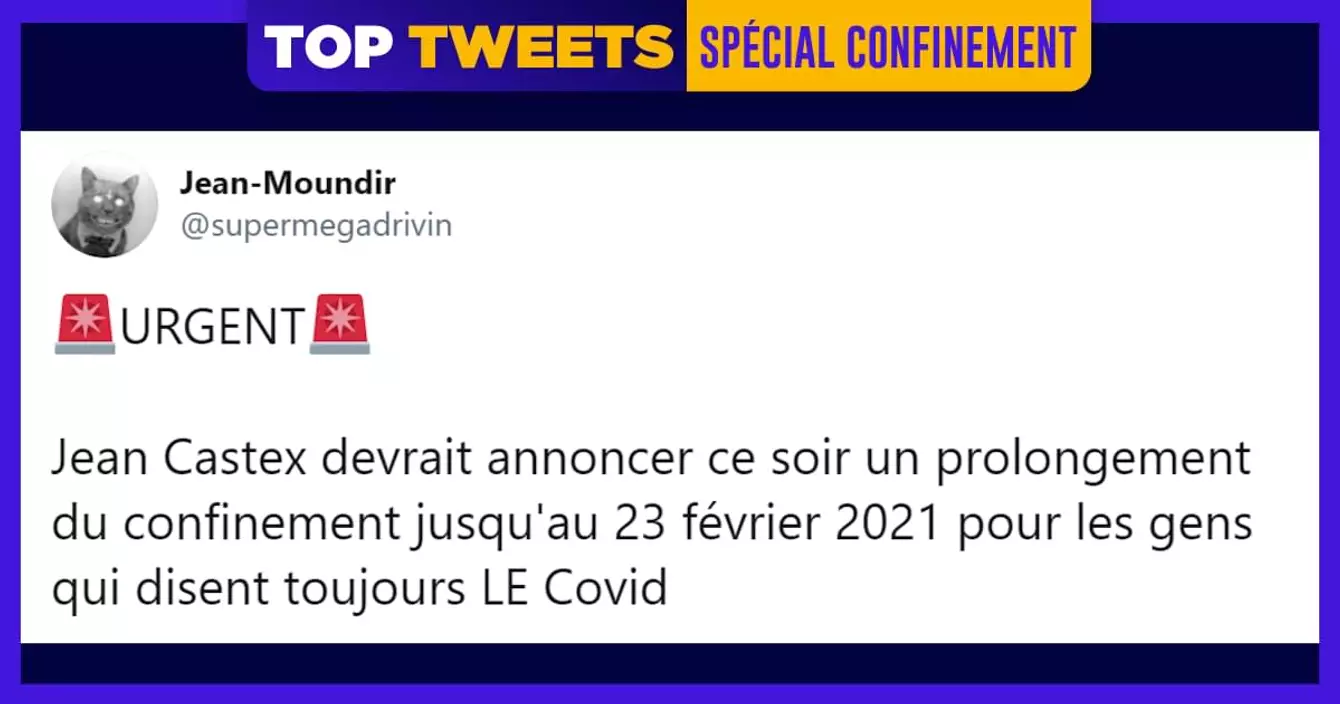 Bonjour, c'est la police municipale. Veuillez cocher la case « big délire » de votre attestation car on est parti pour le 14ème top tweets du reconfinement youhouuuu. Allez, je reprends mon sérieux : tout ceci était une petite mise en scène pour vous mettre dans les meilleures conditions afin d'apprécier tous les petits tweets qui vont suivre. A part ça, j'espère que vous allez bien. Moi bof, je me suis fait arracher une dent tout à l'heure et maintenant je chante Tu ne m'as pas laissé le temps de David Hallyday en pensant à elle. Voilà voilà.
