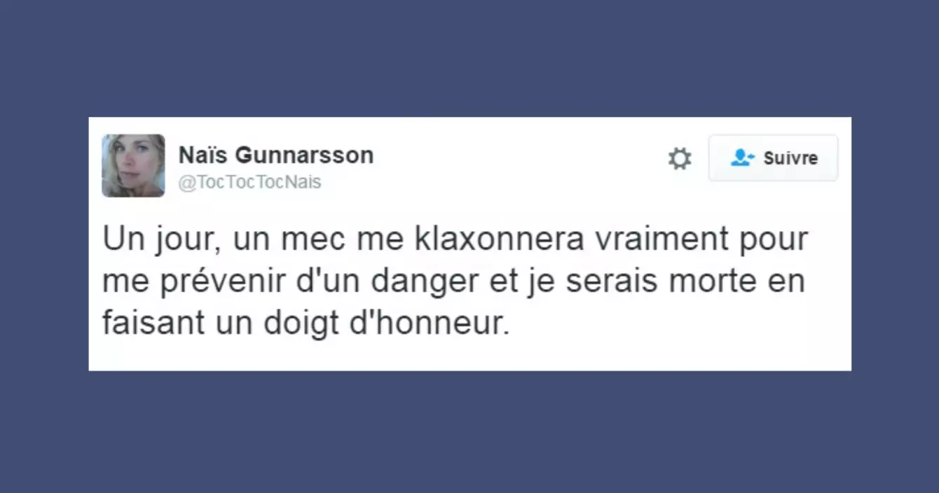 Un jour, un mec me klaxonnera vraiment pour me prévenir d'un danger et je serais morte en faisant un doigt d'honneur.