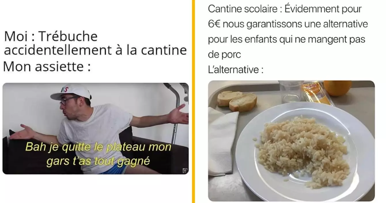Salut tout le monde, si vous voulez tout savoir je reviens de vacances et je m'aperçois que tous les élèves de France sont rentrés à l'école (les pauvres). Du coup, je pense à eux et à ce qu'ils vont manger cette année, à savoir un truc pas très bon à la cantine. On a tous connu ce lieu qui possède une odeur ne ressemblant à aucune autre et où nos espoirs de frites étaient souvent déçus. Pour se remettre, on va regarder des memes drôles sur le sujet de la restauration scolaire. Les bonnes manières n'ont pas changé : si vous aimez les memes, vous pouvez vous abonner aux comptes Insta.