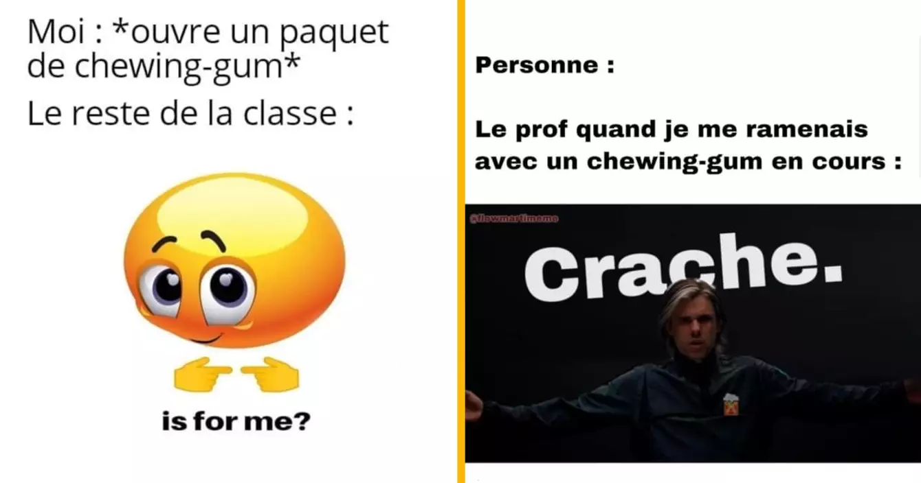 Le chewing-gum est un bon moyen de ne plus puer de la gueule et de se faire des amis. Déjà, parce qu'en ayant une bonne haleine, les gens ont envie de nous approcher, mais aussi parce que les gens se dirigent toujours vers quelqu'un qui a des chewing-gums pour lui en taxer. Moralité : ayez toujours des chewing-gums sur vous, et vous serez plus heureux. Sur ce, voici quelques memes sur les chewing-gums, comme vous l'aurez deviné.
