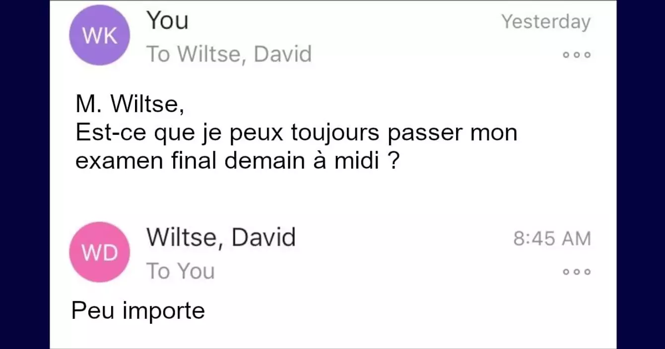 « Monsieur Wiltse, est-ce toujours bon pour vous si je passe mon examen final demain à midi ? Je vous laisse me redire. »