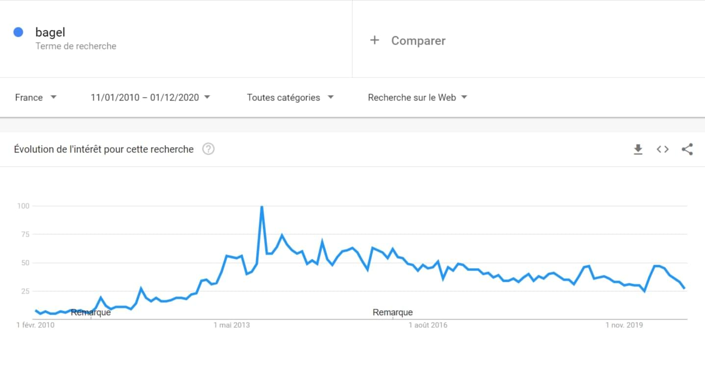 On a tous eu une période où on bouffait tous des bagels en 2013, généralement avec du saumon fumé et de la crème fraîche. C'était sympa, ouais, mais ce truc du pain avec un trou dedans, à part pour y foutre un œuf mollet, on n'a toujours pas compris le concept. Du coup, les recherches de bagels n'ont fait que chuter d'année en année depuis.