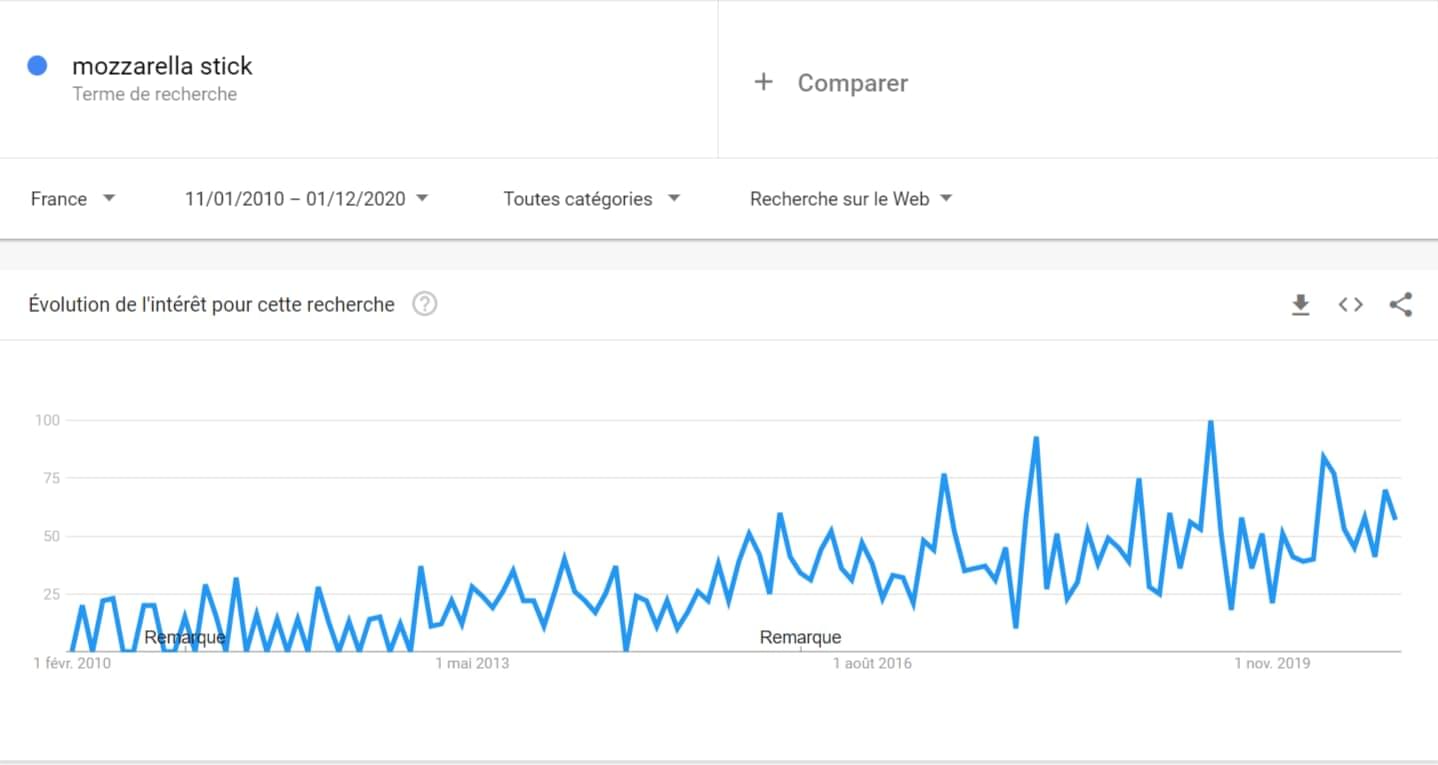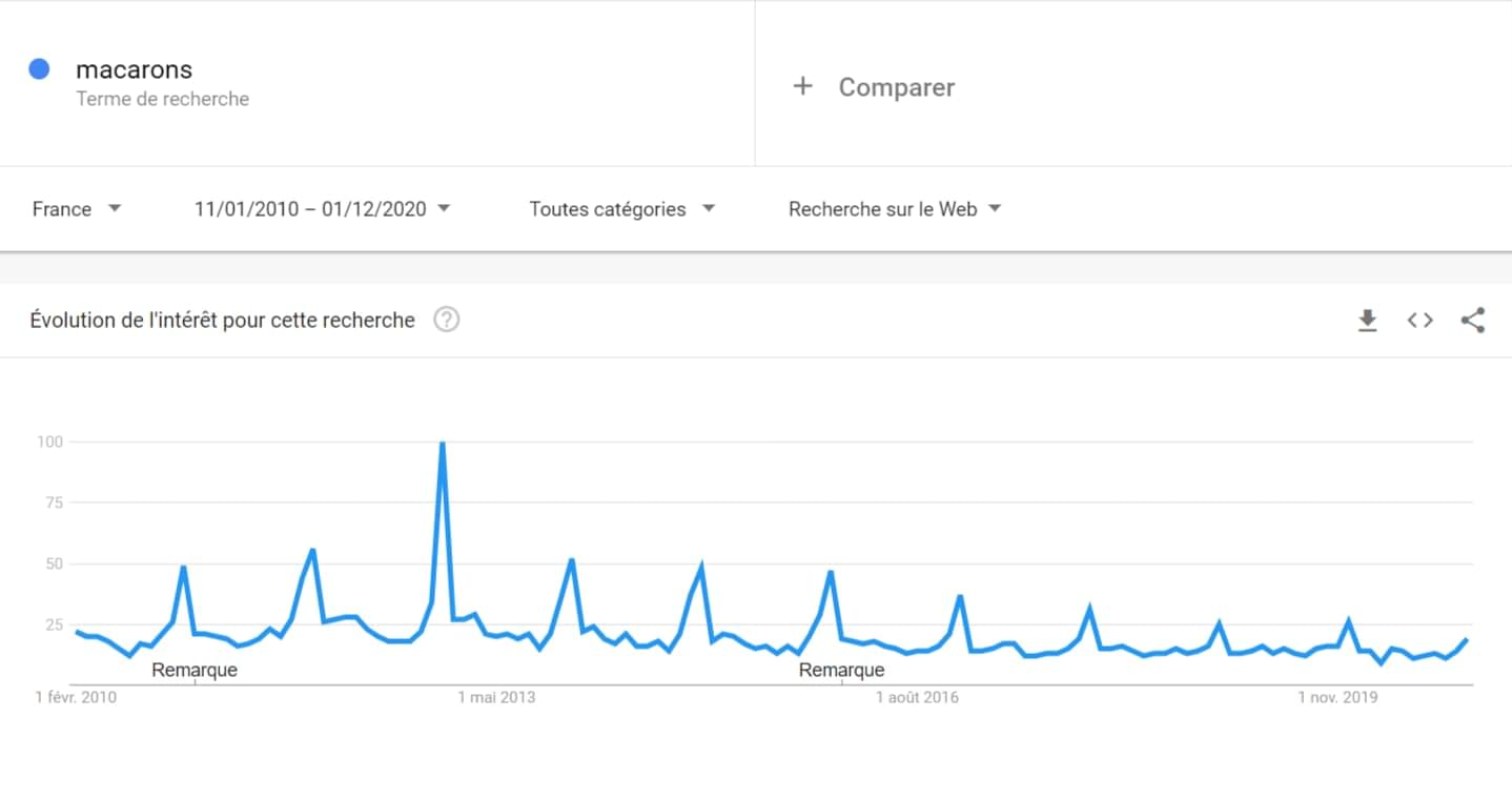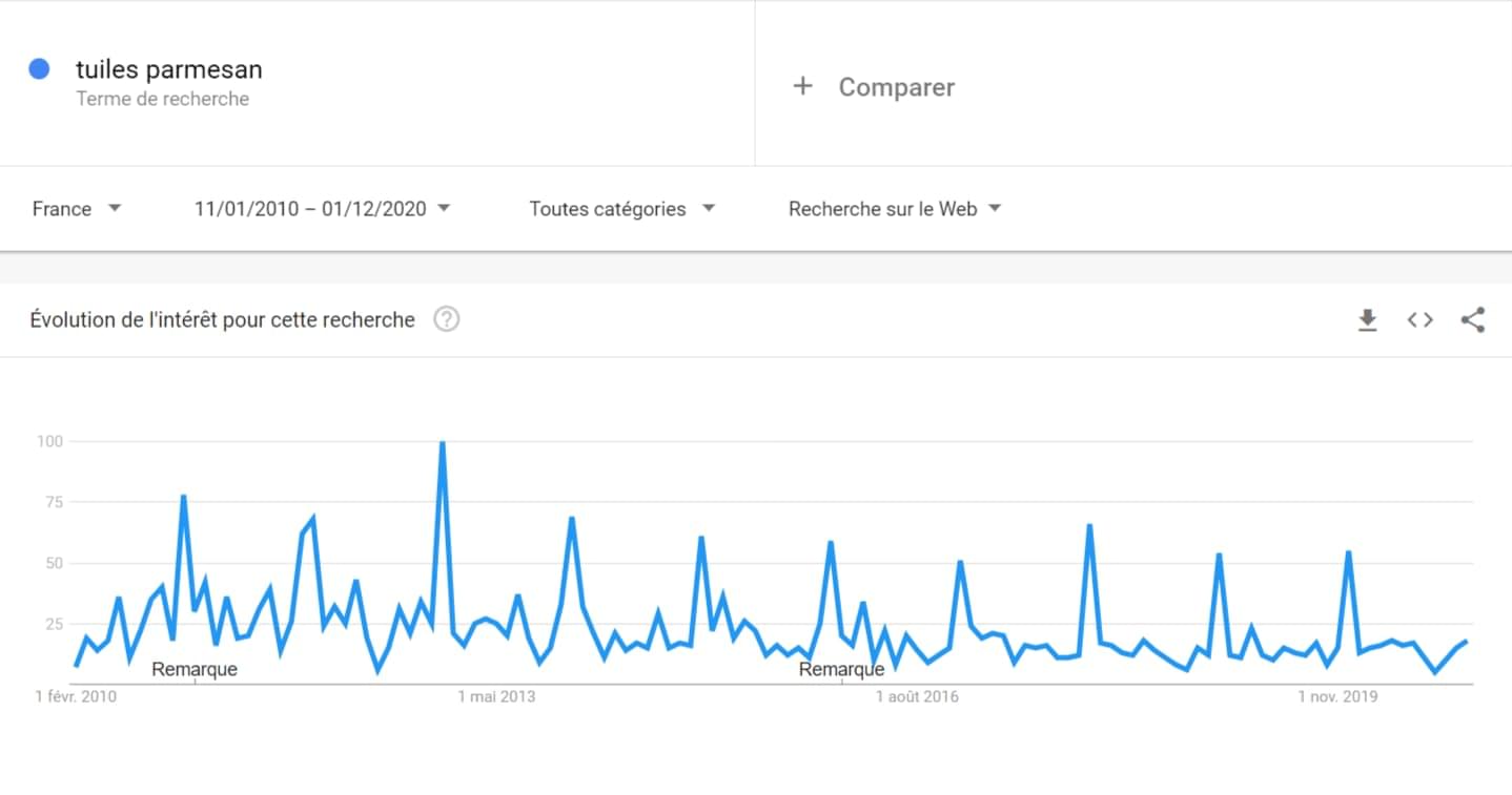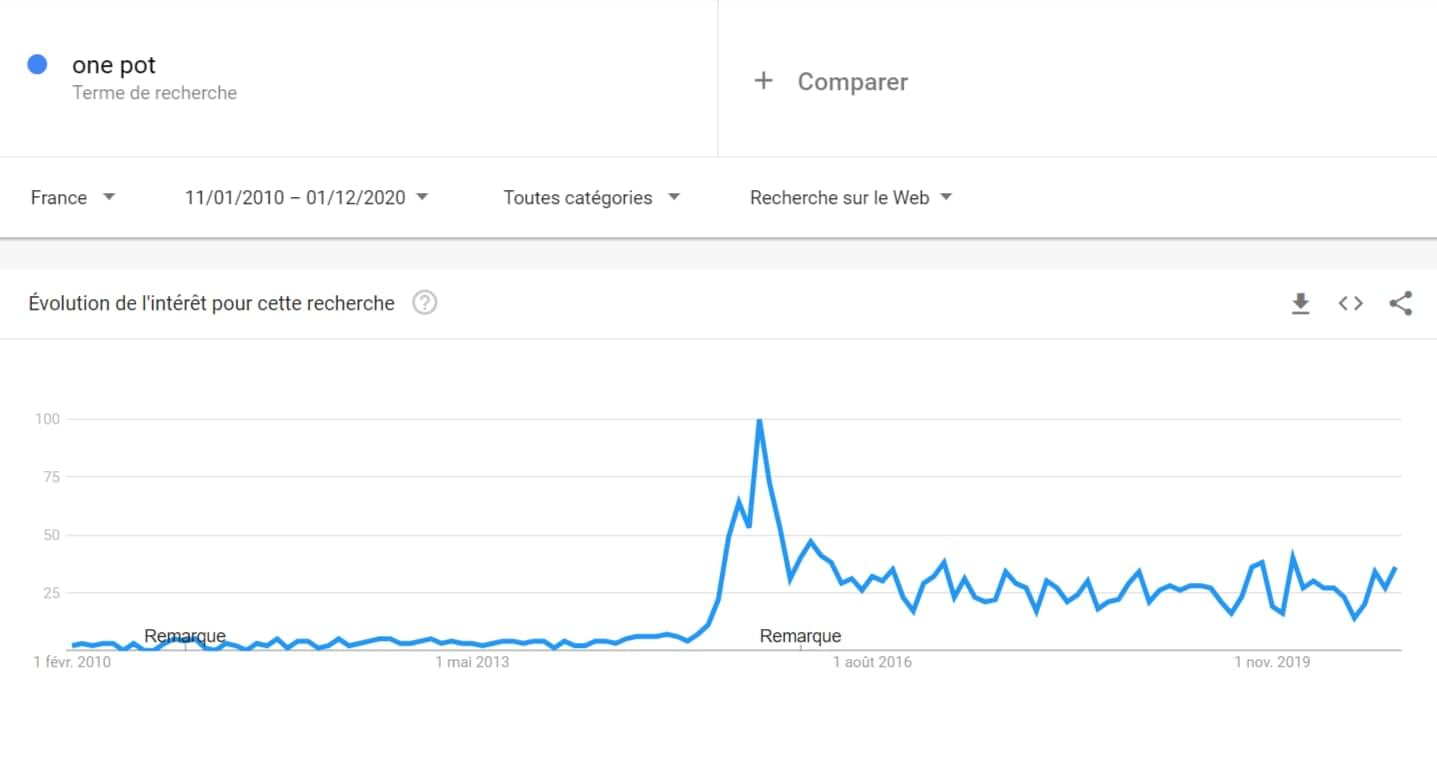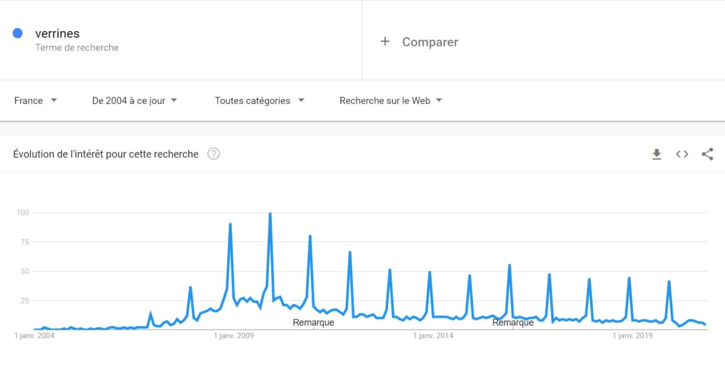 Rassurez-vous les petits fans de verrines : vos petites recettes dans des mini-verres ne sont pas encore totalement mortes. La preuve, on voit qu'il y a un pic de recherche à chaque période de fêtes. N'empêche, ça a vachement baissé depuis 2009.