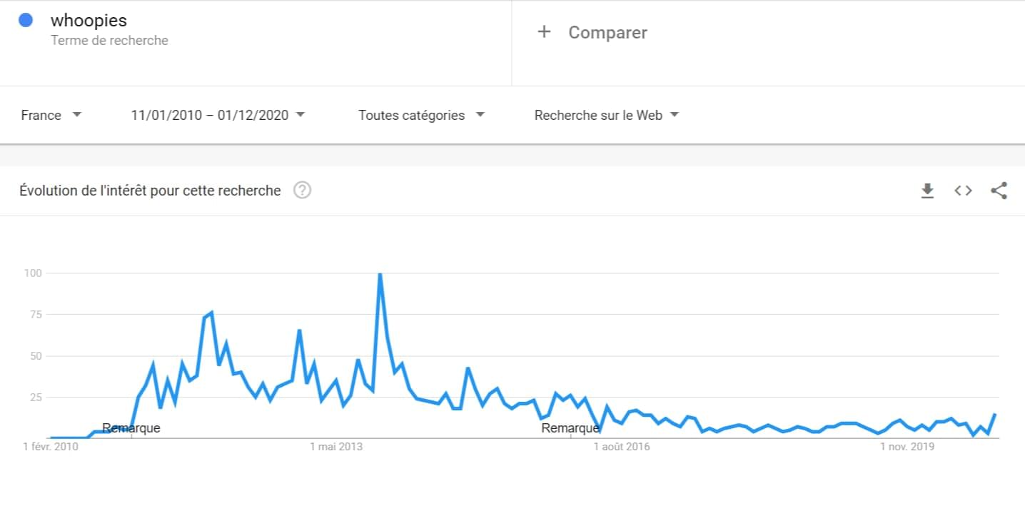 Qui se souvient des whoopies, ces sortes de gâteaux/sandwich où on enfermait de la crème entre deux biscuits ? C'était monstrueusement calorique, mais c'était génialement bon. Pourtant, on a perdu toute trace de leur existence depuis fin 2013. Ils reposent désormais en paix dans le cimetière des anciennes modes culinaires.
