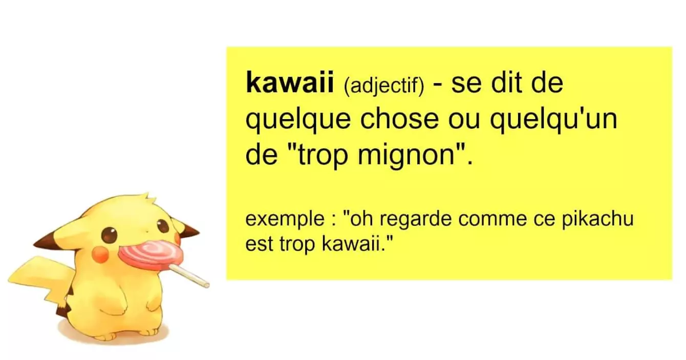Peut-être et sûrement le mot qui rentrera le plus facilement dans le dictionnaire. On pourrait le traduire simplement par « mignon » mais il s'applique à des choses mignonnes nippones. Pikachu est kawaii alors que Idefix reste mignon… quoique il est aussi un peu kawaii.