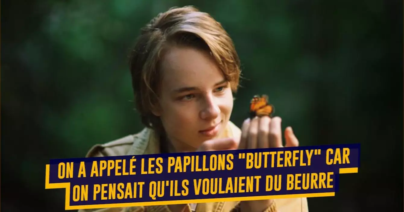 Littéralement, butterfly se traduit par « la mouche à beurre ». Mais pourquoi ? Une légende raconte qu'au Moyen-Âge, les gens pensaient que cet insecte picorait le beurre et le miel laissés sur la table avec sa petite trompe toute mignonne. En réalité, c'est probablement parce que les ailes du papillon le plus commun ont la couleur du beurre.