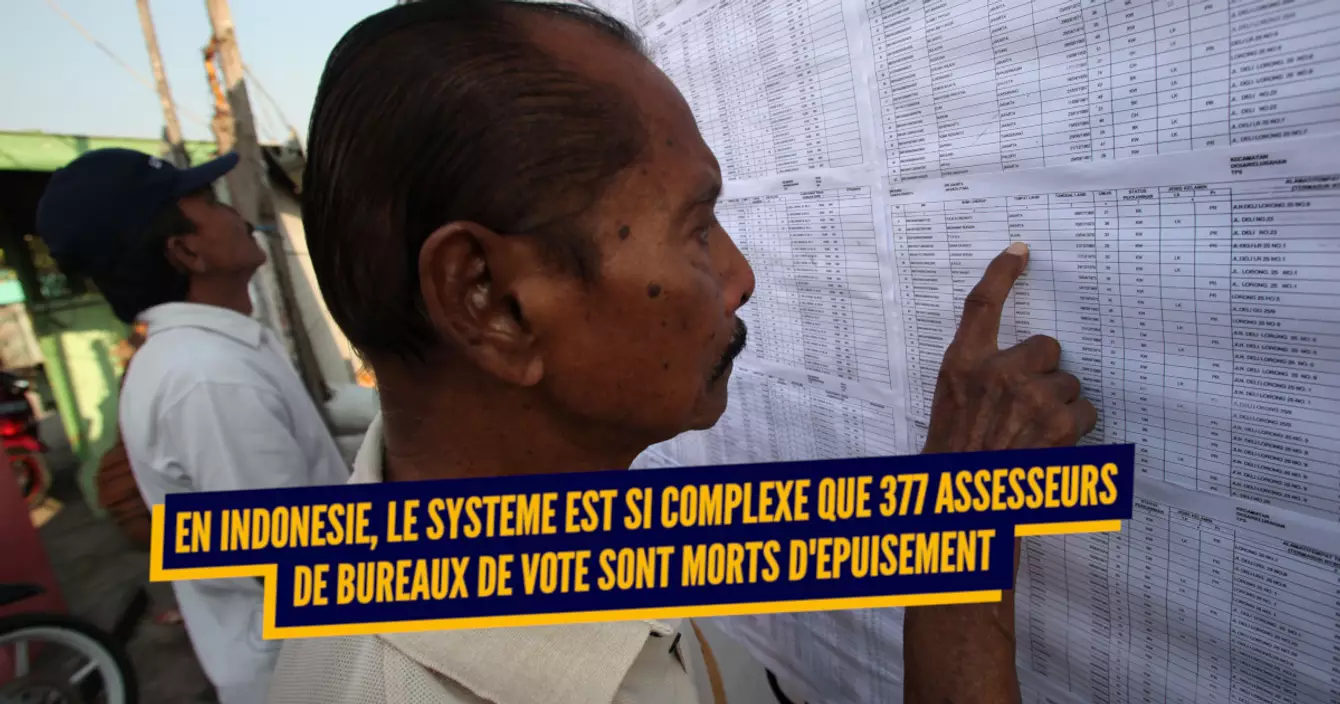 L'Indonésie, c'est un pays très peuplé et très galère : plusieurs milliers d'îles, des centaines de milliers de candidats locaux… Au total, le scrutin nécessite la mise à disposition de 800.000 bureaux de vote qui emploient 6 millions d'employés temporaires pour assurer le suivi du scrutin et son dépouillement. Et cette année, l'Indonésie a organisé 5 scrutins en même temps. Les employés devaient tout dépouiller en un mois : qu'ont-ils fait ? Ils sont morts d'épuisement. Non, je ne déconne pas, ils sont morts d'épuisement, pour de vrai. Morts. Genre ils respirent plus.
