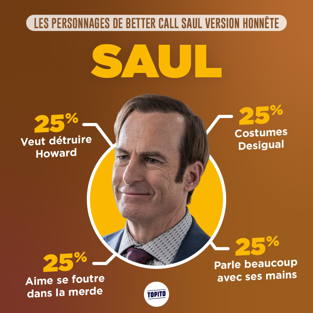Ayé. La dernière saison de Better Call Saul est finie. On a du faire nos adieux avec cette série qui surpasse hautement Breaking bad. On du se faire à l'idée qu'on ne verrait plus Jimmy McGill, cet anti-héros de génie. Pour mieux supporter ce drame, voici donc nos personnages préférés résumés en infographies. Ciao, Saul.