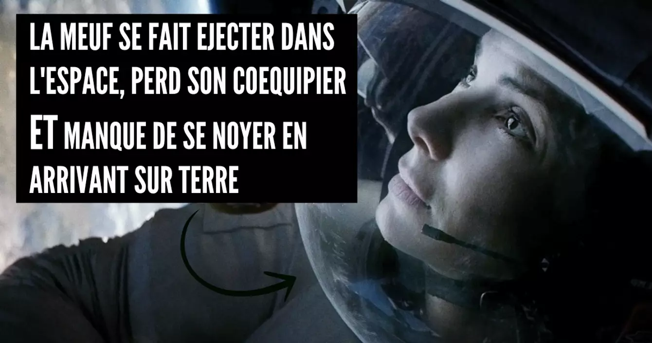 Ryan Stone (Sandra Bullock) se fait percuter par un satellite, perd son coéquipier en route et se retrouve paumée dans l’espace toute seule, avec une réserve réduite d’oxygène puis manque de se noyer au moment où elle arrive enfin à revenir sur terre. Clairement, c’était pas son heure. Faut espérer dans ce genre de situation que tu ne meures pas en glissant sur une peau de banane juste après.