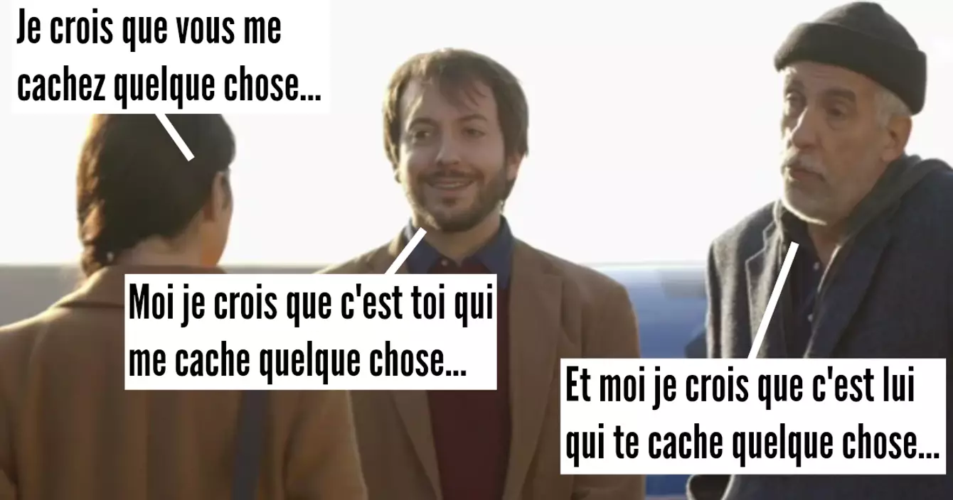 C'est la base de toute intrigue. Il y a un ou des personnages qui introduisent l'histoire. Puis d'autres personnages qui interviennent. Sauf que le/s premier/s ont toujours un moment de réflexion qui consiste à mettre en doute les dires des autres personnages « parce qu'on pense qu'ils nous cachent quelque chose ». Du coup, c'est clairement une phrase clé dans l'élaboration de l'intrigue qui s'avère souvent plus complexe qu'on ne le croit au départ. Parce que je pense que les scénaristes nous cachent quelque chose.