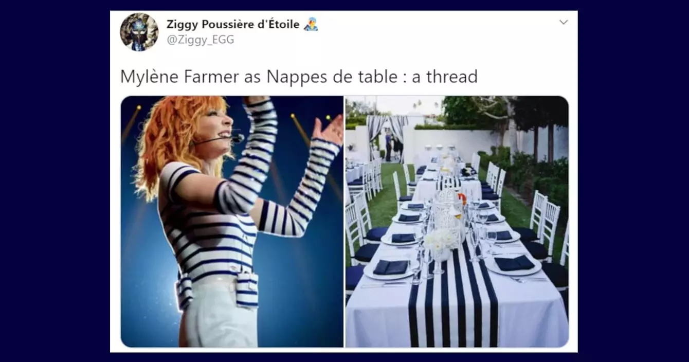 Mylène, c'est comme Céline. C'est notre idole, notre queen, même si parfois elle est un peu ché-per. Et si on l'aime d'amour, ce n'est pas pour autant qu'on valide son style à 2 000 %. Un twittos s'est amusé à répertorier toutes les fois où Mylène a mis une nappe pour se fringuer et franchement, ça pose des questions quant à l'existence de quelconques codes vestimentaires.