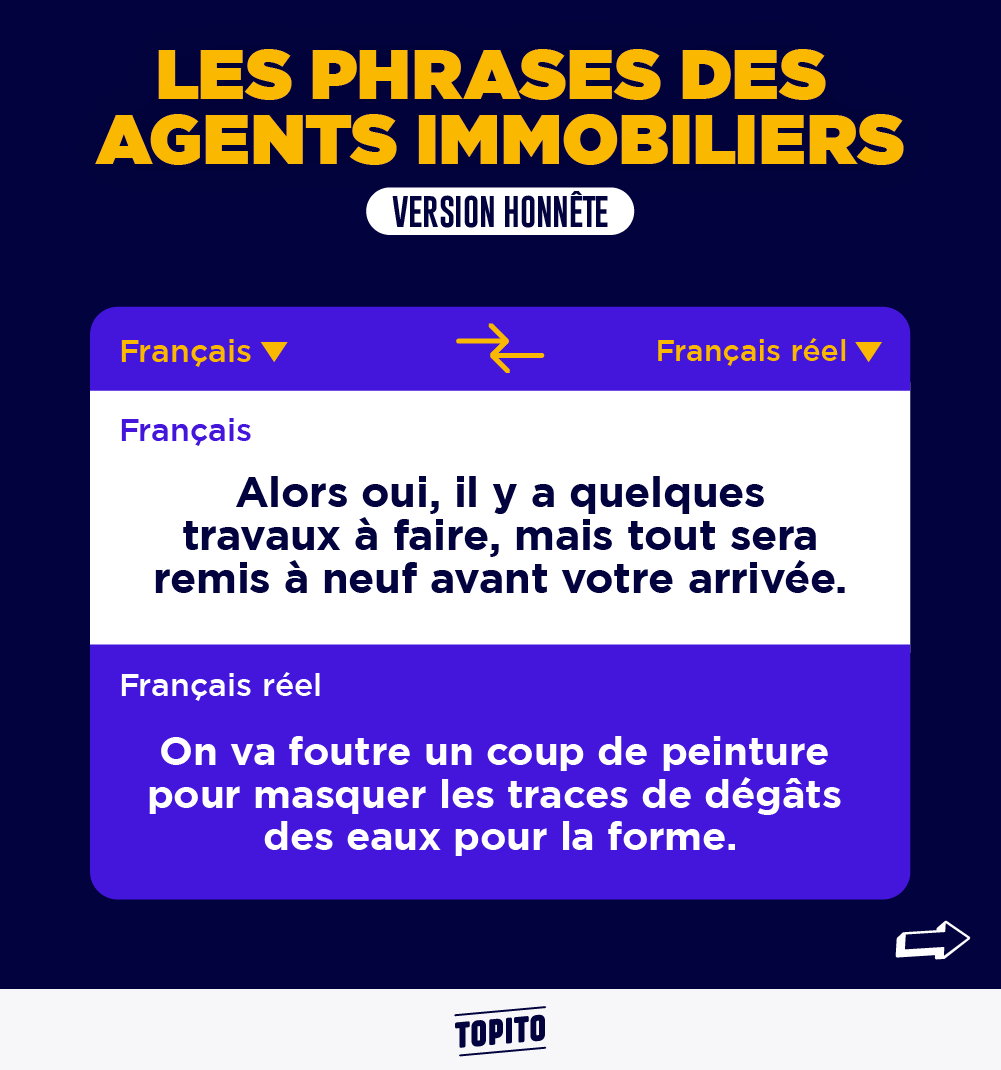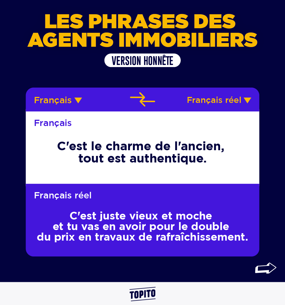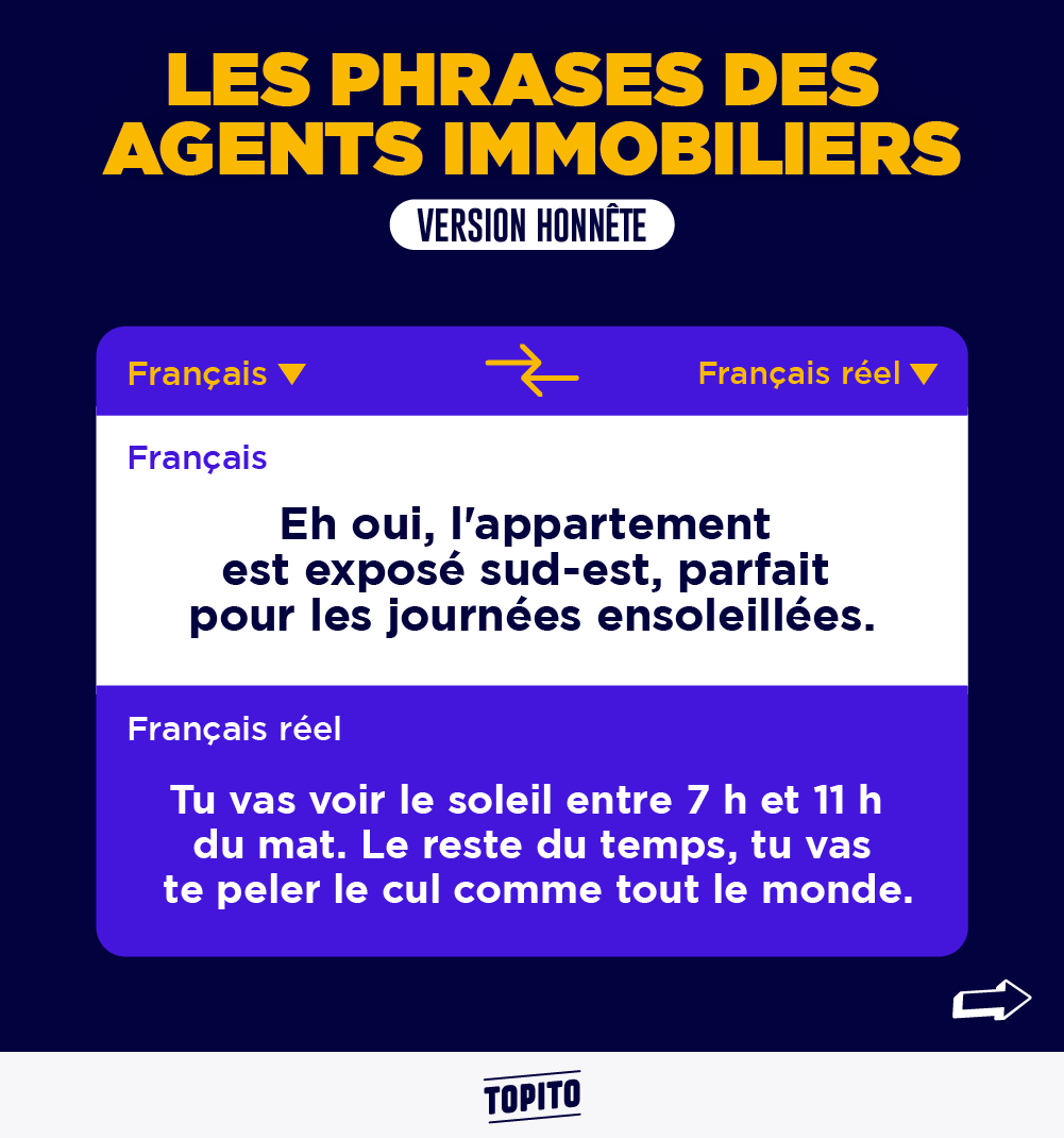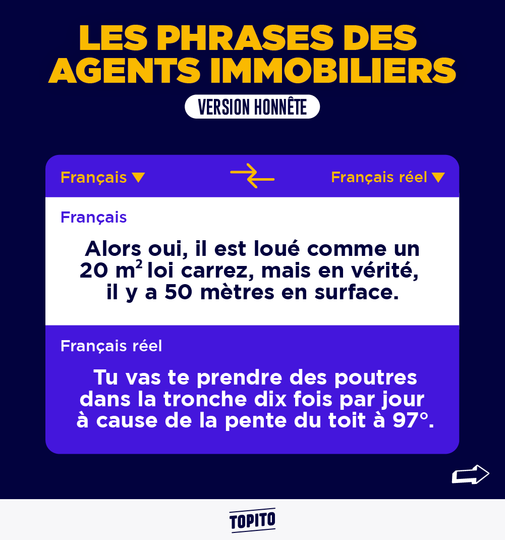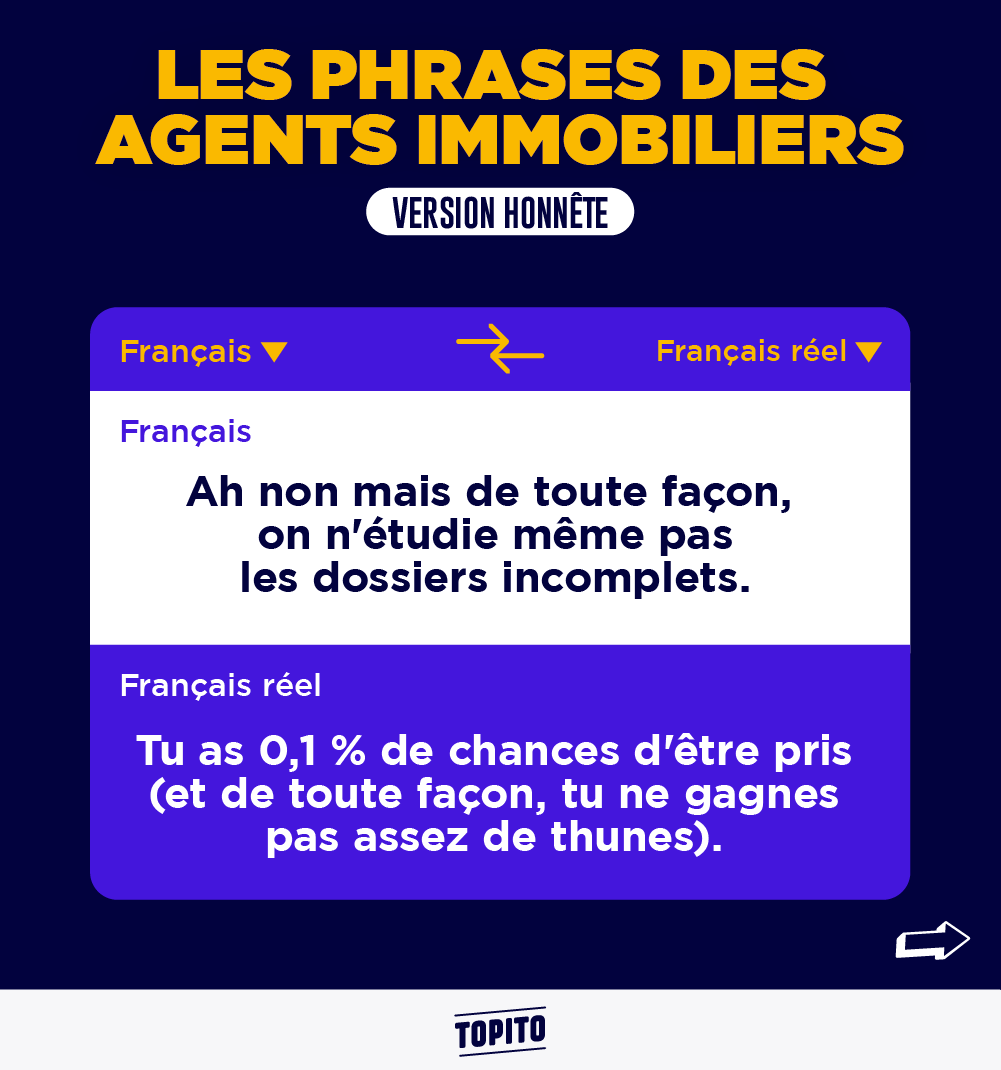 Parmi les phrases que ton agent immobilier ne te dira jamais, il y a d'abord « En vrai, le loyer est beaucoup trop cher pour ce que c'est, on va vous faire un petit -50% de rabais. ». Mais il y a surtout toutes ces horribles vérités qu'il masque avec des jolis mots pour nous emberlificoter et nous fait acheter un triplex en région parisienne alors qu'on voulait une maison près de Lorient. Grâce à nous, vous ne vous ferez plus avoir et votre PEL en sera bien sauvegardé. Ou alors tu deviendras un super agent immobilier, c'est toi qui vois.