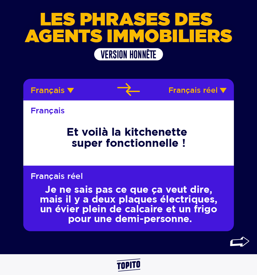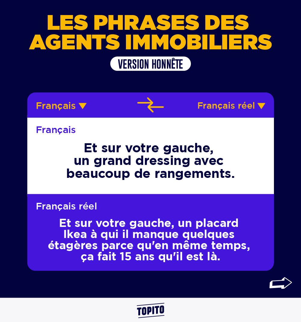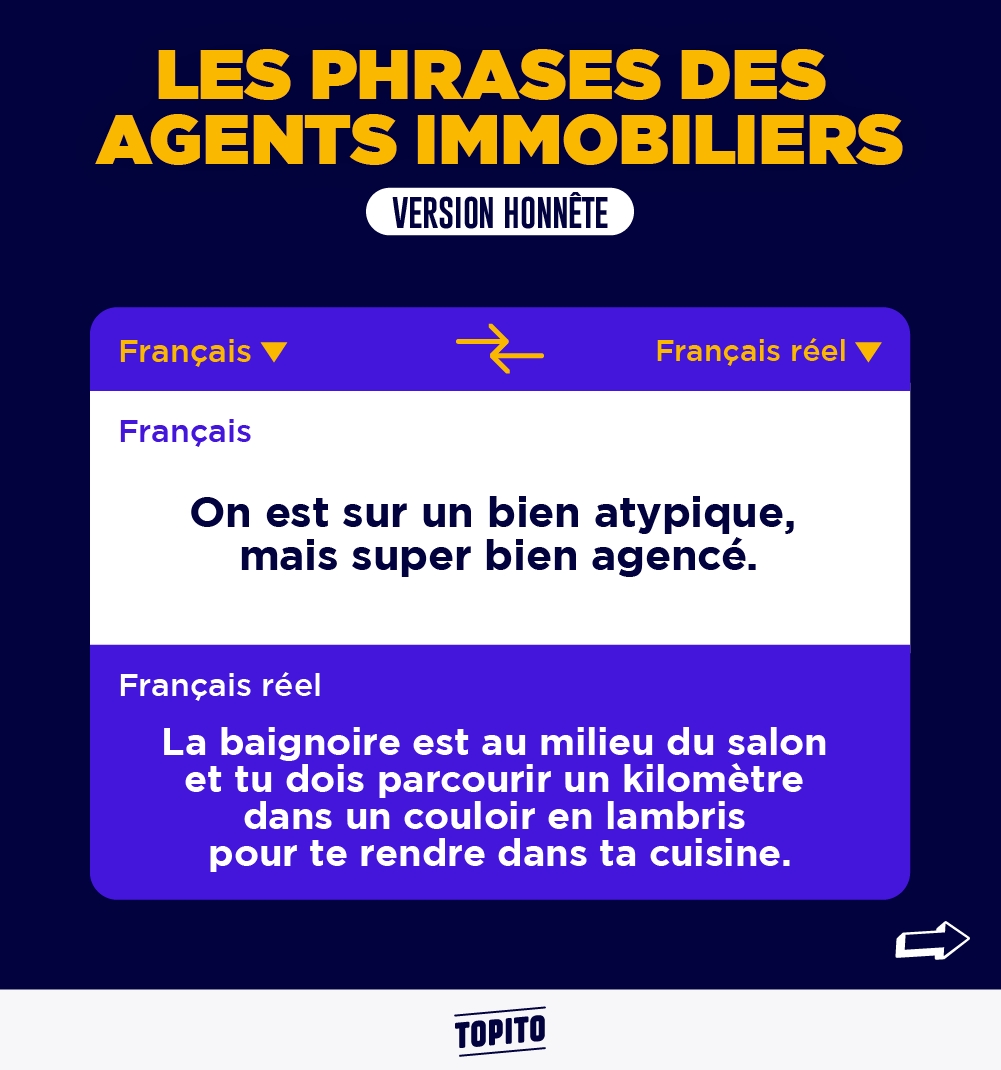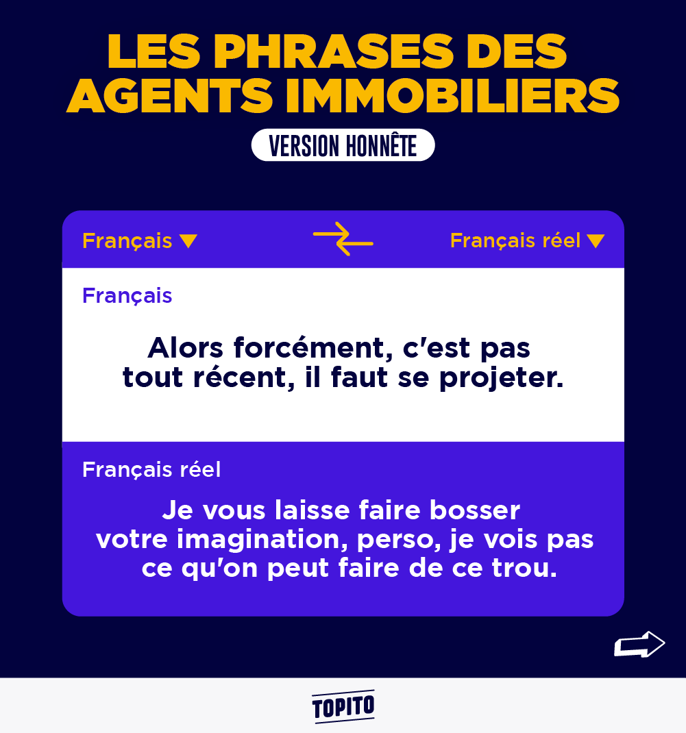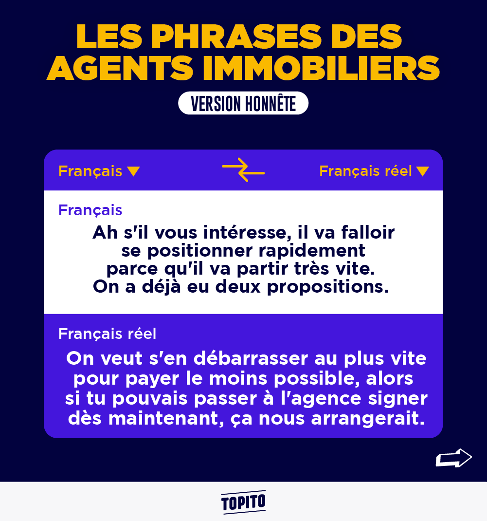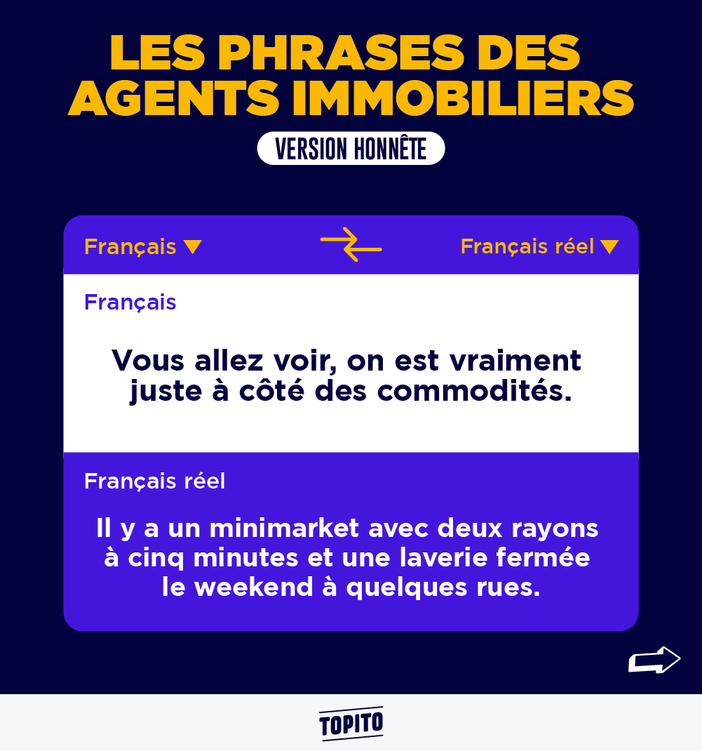 Parmi les phrases que ton agent immobilier ne te dira jamais, il y a d'abord « En vrai, le loyer est beaucoup trop cher pour ce que c'est, on va vous faire un petit -50% de rabais. ». Mais il y a surtout toutes ces horribles vérités qu'il masque avec des jolis mots pour nous emberlificoter et nous fait acheter un triplex en région parisienne alors qu'on voulait une maison près de Lorient. Grâce à nous, vous ne vous ferez plus avoir et votre PEL en sera bien sauvegardé. Ou alors tu deviendras un super agent immobilier, c'est toi qui vois.