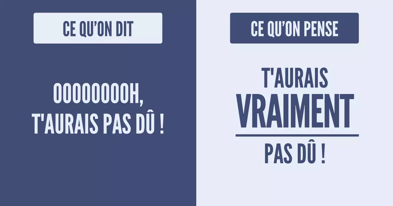Outre la dinde, la picole, les réflexions racistes de mamie et les blagues salaces de tonton, le réveillon de Noël c'est aussi et surtout un bel exercice de maîtrise de soi et un grand numéro de comédien quand on doit avoir l'air ravi devant un cadeau pourrave ("si si vraiment, je rêvais depuis toujours de cette robe Desigual). Si vous n'aviez pas encore capté qu'il y a une sacrée différence entre ce qu'on dit et ce qu'on pense, voici donc un petit guide bien pratoche.