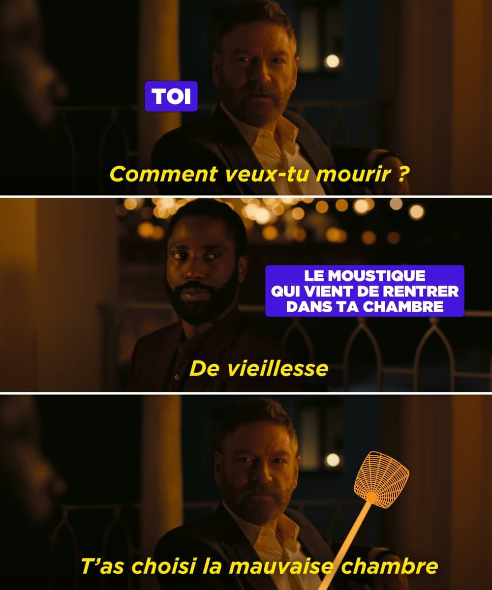 « Tu te rends compte que si tous les moustiques se mettaient à faire la même chose que toi, le monde partirait en couille ? Allez, sors d'ici et va réfléchir un peu. »