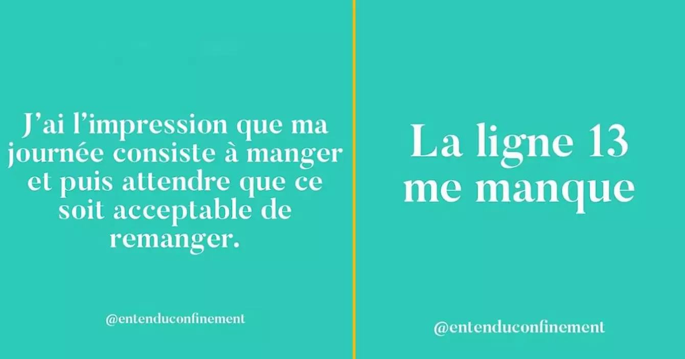 Le compte Instagram Entendu en Confinement regroupe plein de petites phrases sur cette période très spéciale repérées un peu partout sur la toile et dans les médias. Dedans, il y a des perles, des punchlines et autres pépites plutôt drôles que vous où vos potes auriez pu prononcer vous-mêmes. Petite sélection pour vous.