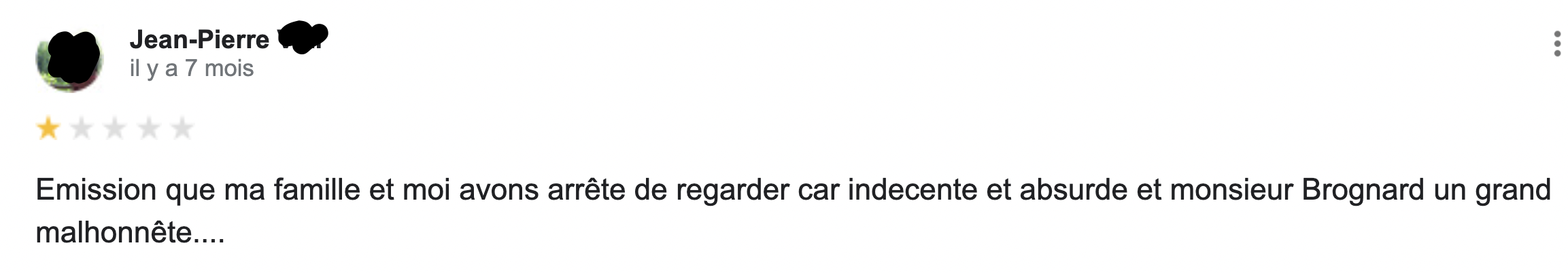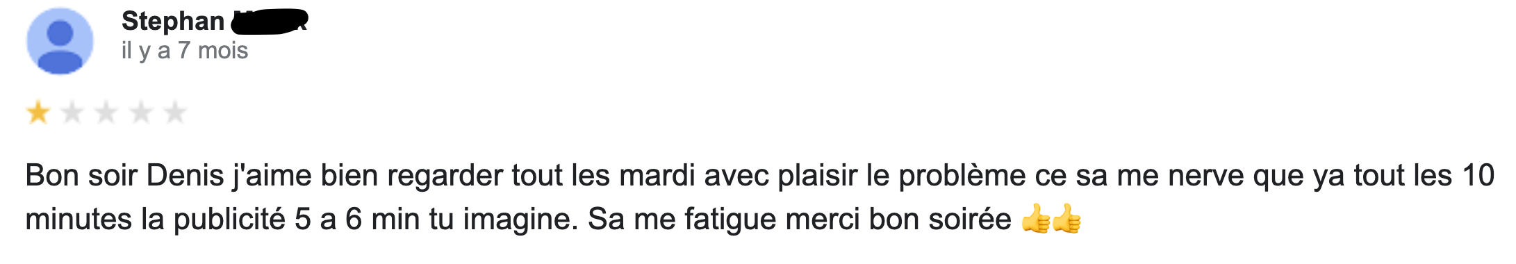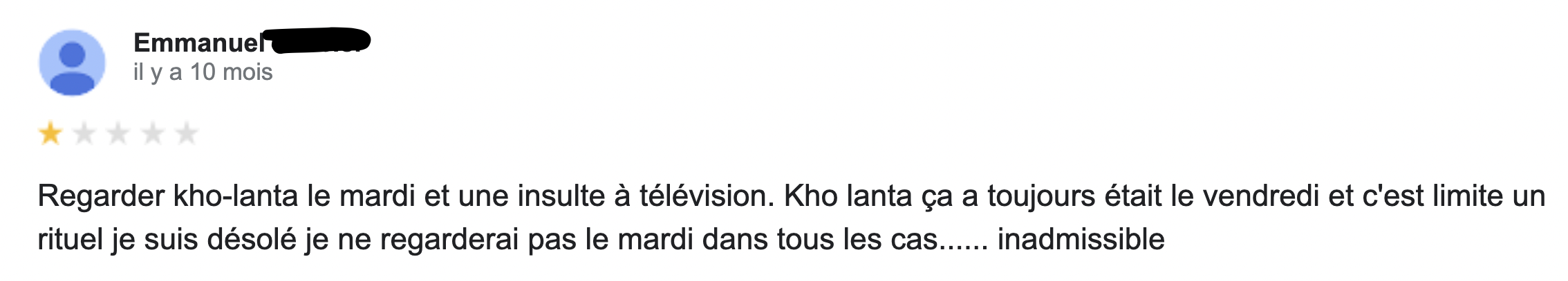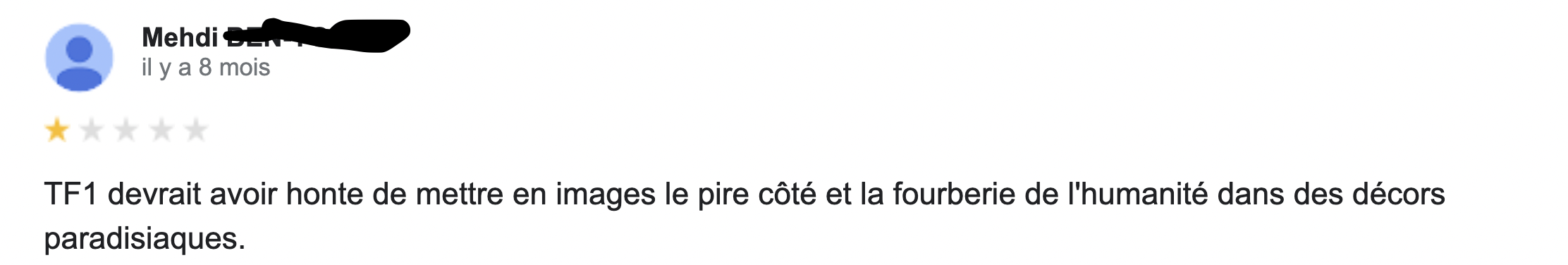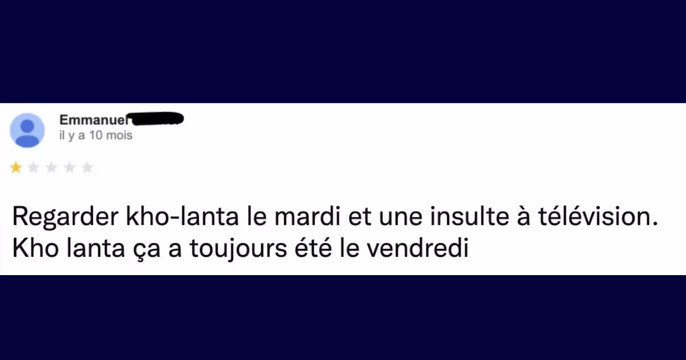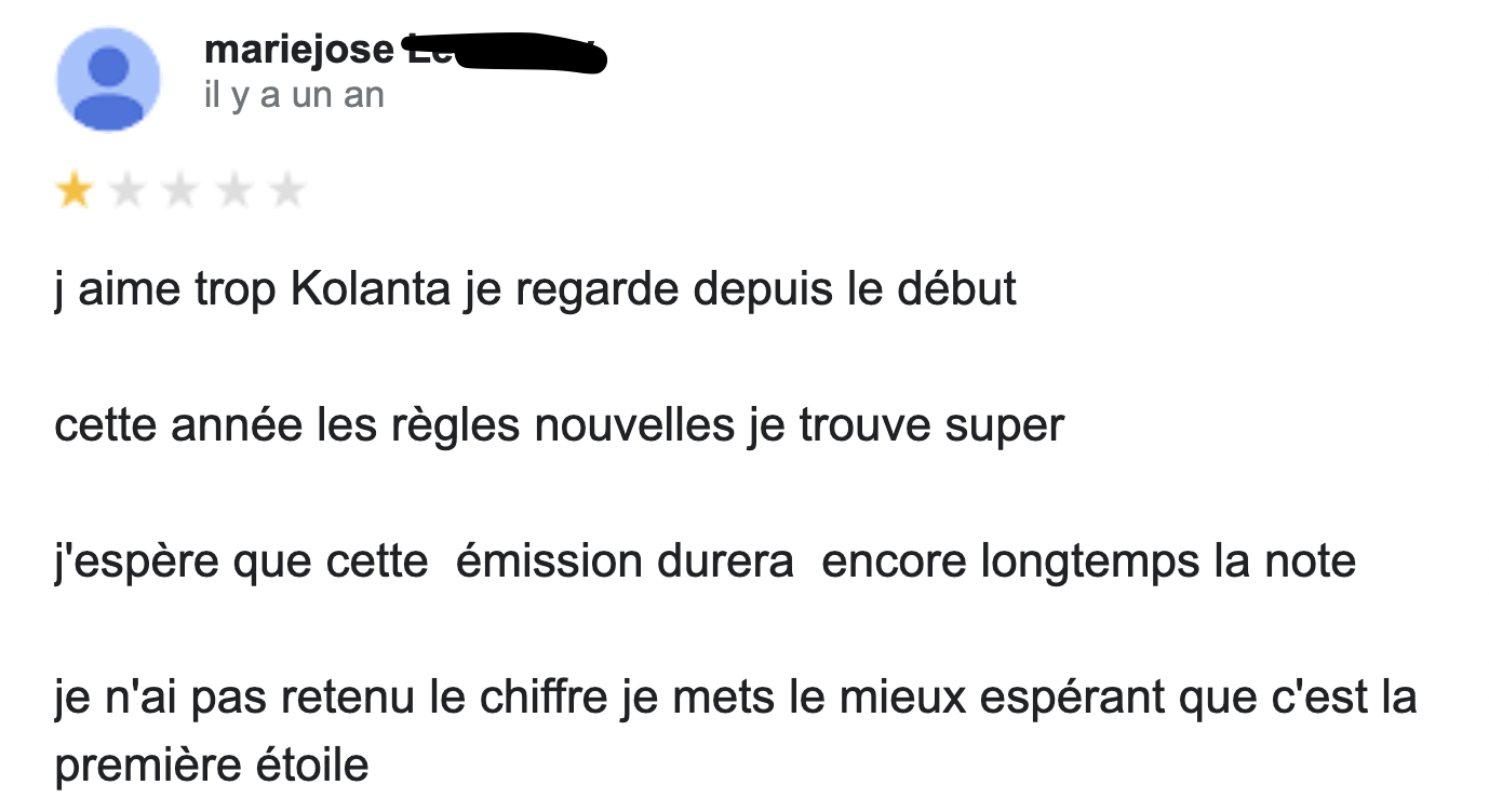 Parmi les grandes questions existentielles qu'on se pose sur la vie il y a celle-ci : qui sont les gens qui laissent des commentaires sur Google ? Sachez en tout cas qu'ils sont nombreux et qu'ils commentent tout et n'importe quoi, y compris les émissions télé. C'est donc tout naturellement qu'on vous livre les meilleurs commentaires Google pour vous mettre un peu de sel dans votre vie.