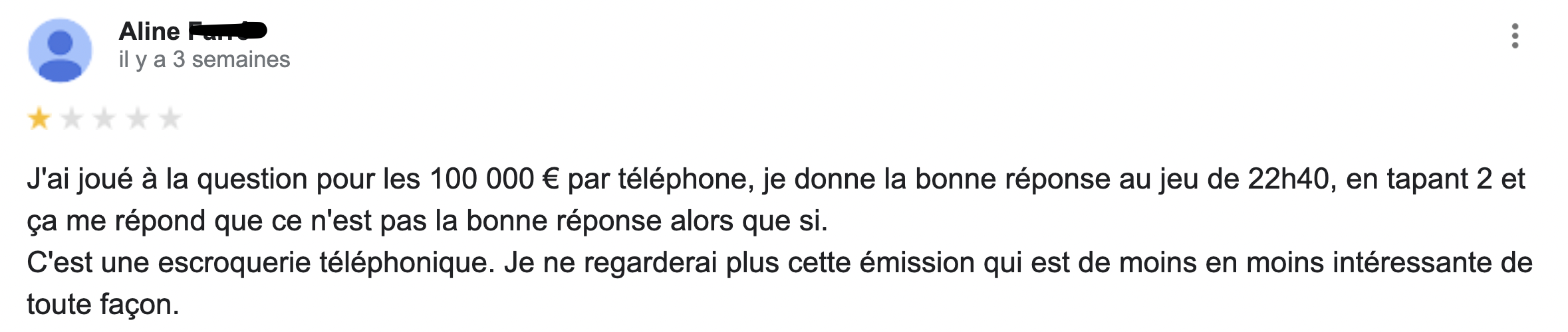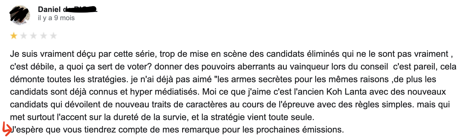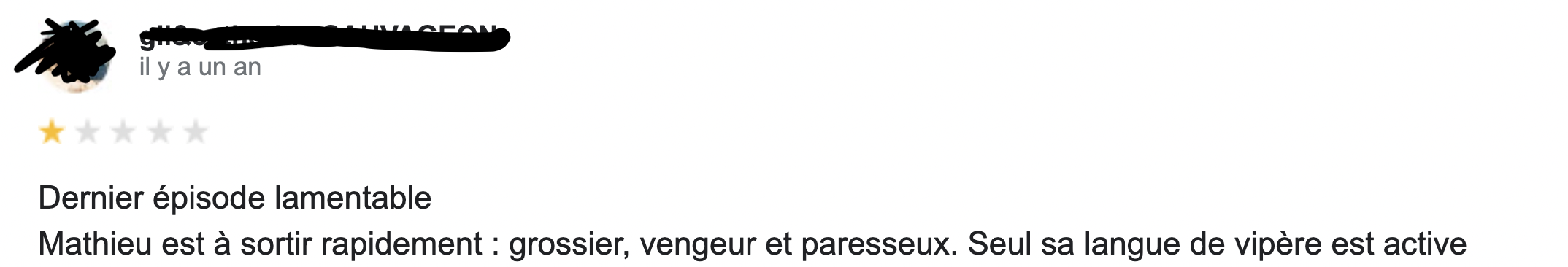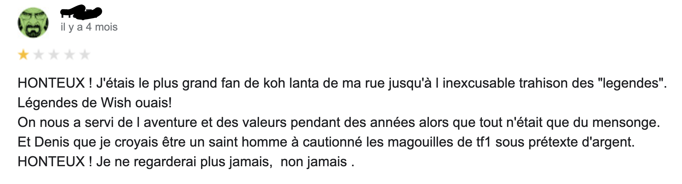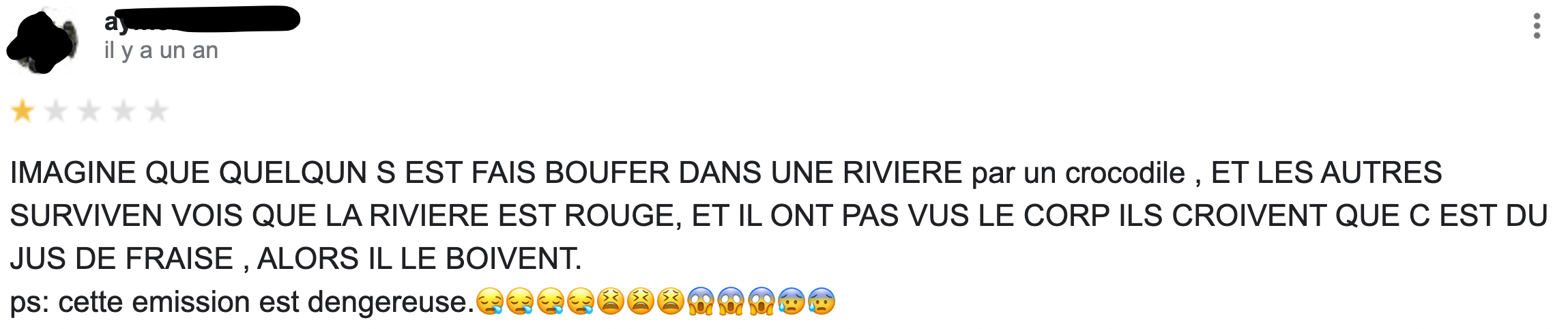 Parmi les grandes questions existentielles qu'on se pose sur la vie il y a celle-ci : qui sont les gens qui laissent des commentaires sur Google ? Sachez en tout cas qu'ils sont nombreux et qu'ils commentent tout et n'importe quoi, y compris les émissions télé. C'est donc tout naturellement qu'on vous livre les meilleurs commentaires Google pour vous mettre un peu de sel dans votre vie.