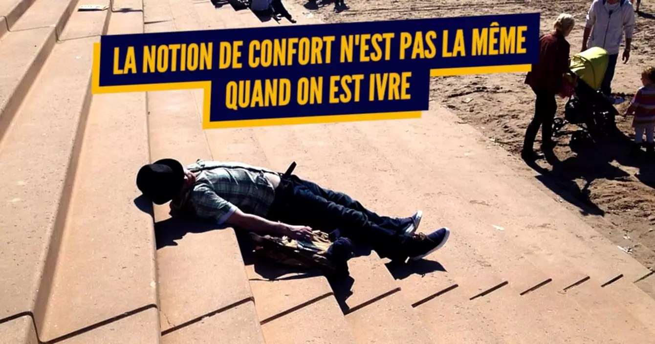 Pourquoi c'est confortable ? Eh bien parce que c'est le circuit court de l'ivresse. A peine a-t-on terminé de se sentir très mal que l'on peut s'allonger tout en ayant le sentiment d'être monté au nirvana de la débranle puisque l'on domine de sa carcasse sommeillante ceux qui ne sont pas encore tout à fait raides.